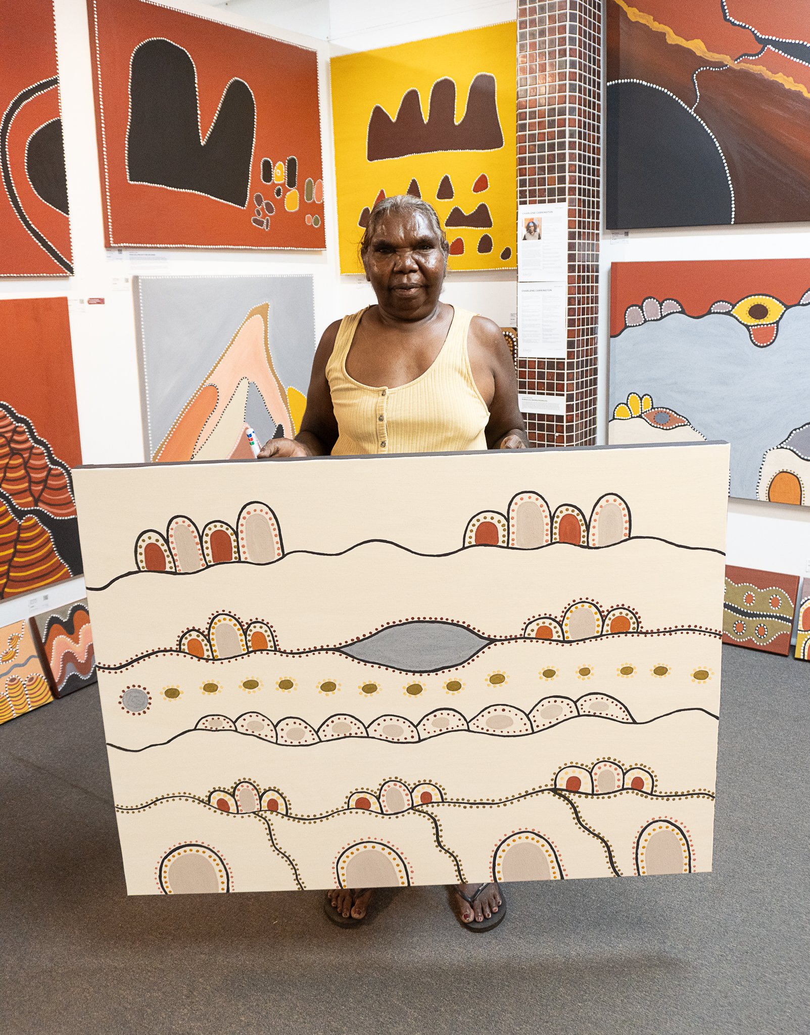 June has an extended family, and through her mother, father, aunties and uncles, is able to paint the huge expanse of Gija land, including Texas Downs, Purnululu and Doon Doon. This gives the artist a wonderful content for her works, and June is fastidious about the Gija Dreaming Stories represented in her paintings. She travels extensively in her country, and paints with precision and authenticity.