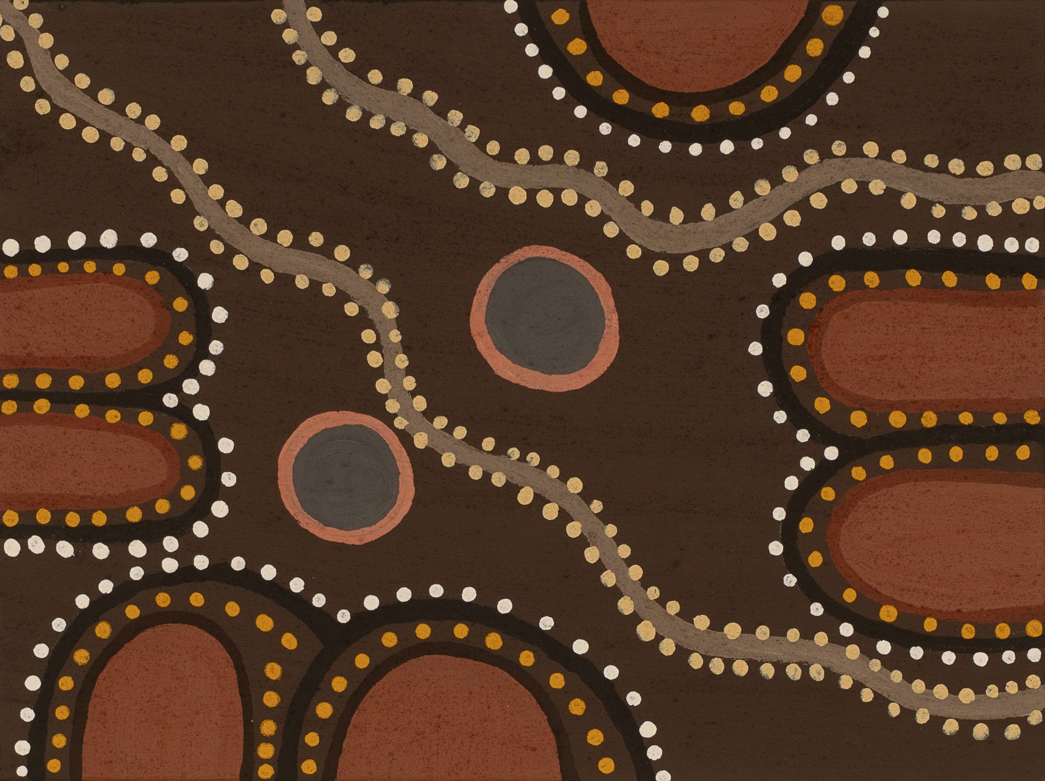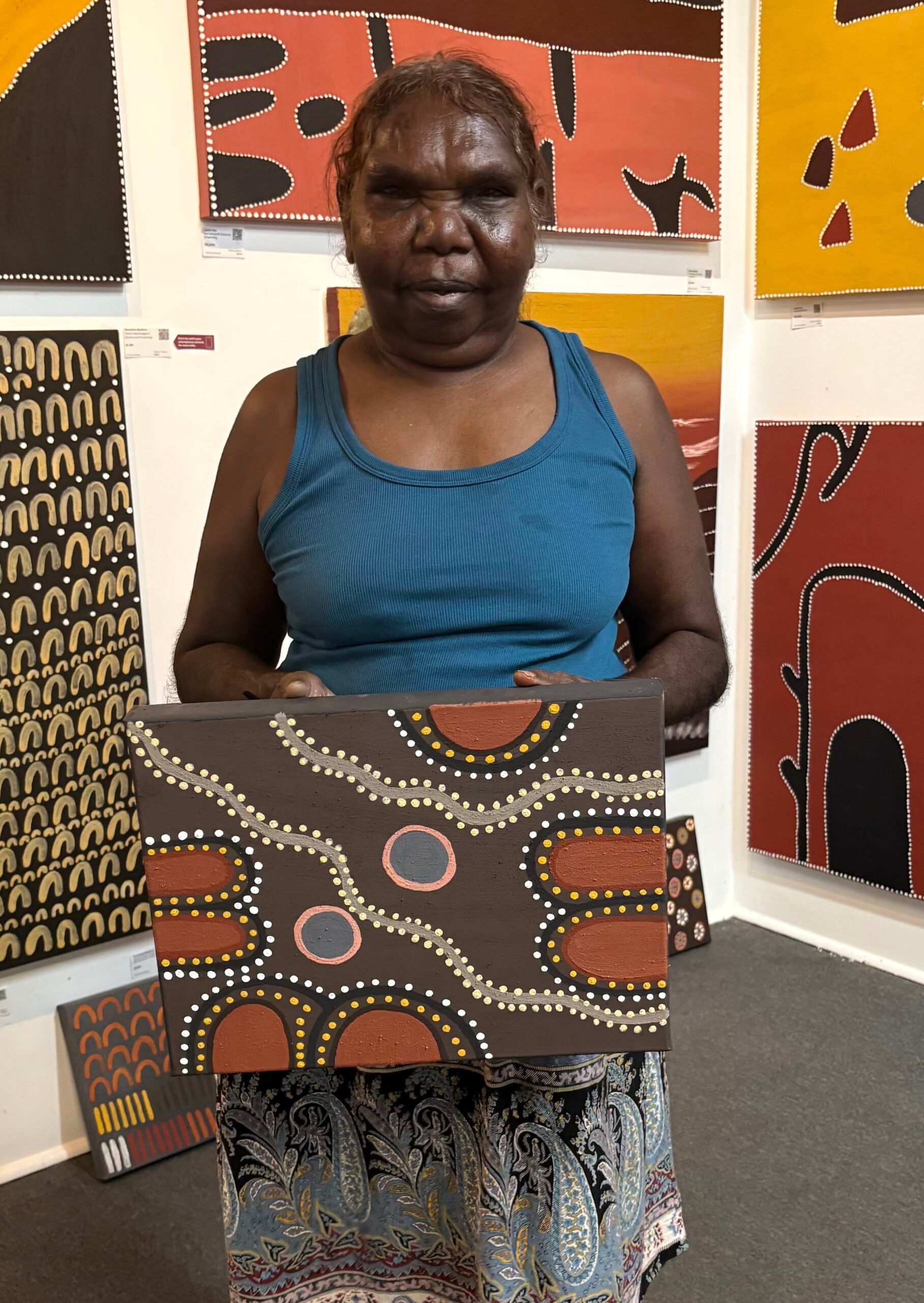 She was taught painting from an early age by the best of our famous first generation ochre artists, including Jack Britten, Madigan Thomas and Lena Nyadbi. These Elders devoted their lives to teaching youngsters culture, Traditional Dreamtime stories and ochre painting technique.