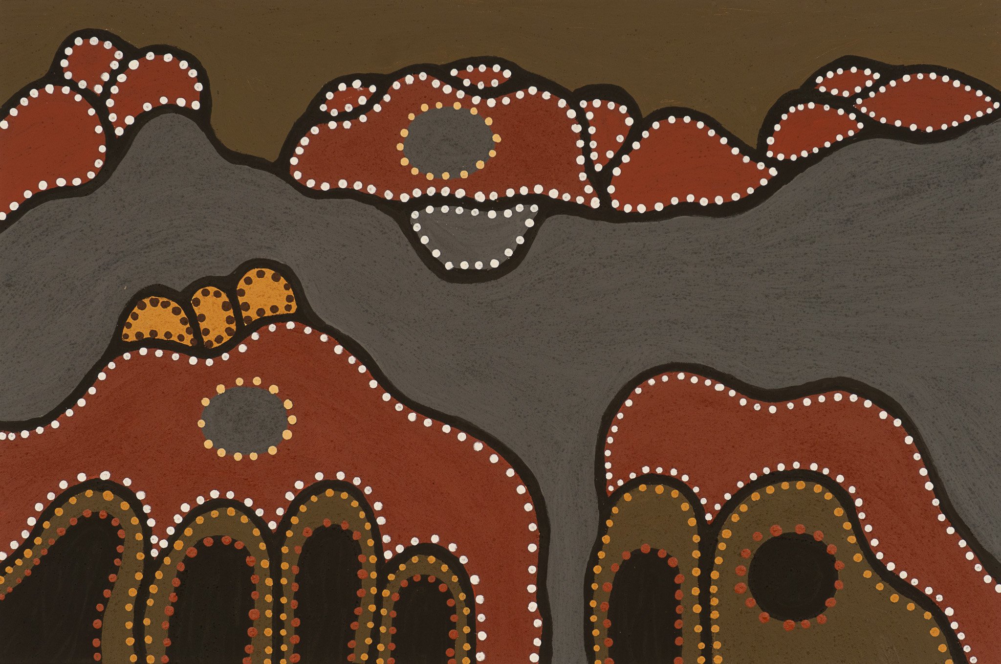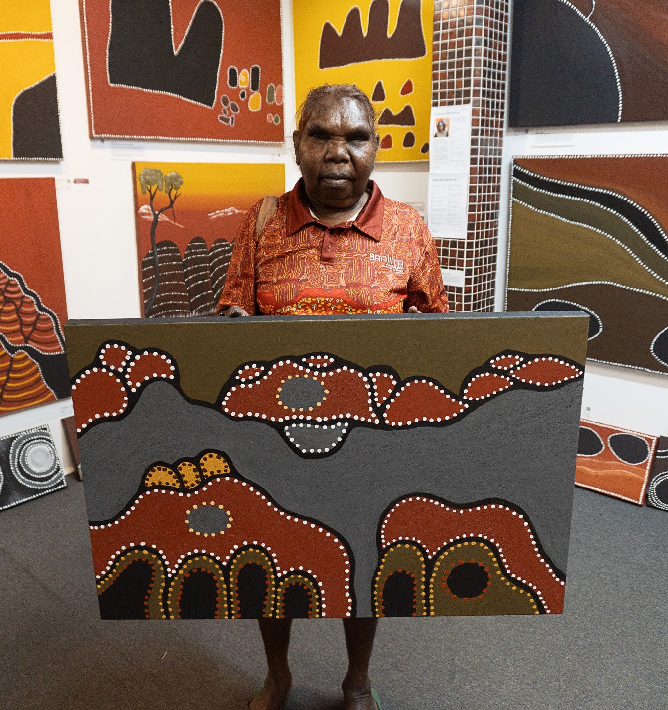 She was taught painting from an early age by the best of our famous first generation ochre artists, including Jack Britten, Madigan Thomas and Lena Nyadbi. These Elders devoted their lives to teaching youngsters culture, Traditional Dreamtime stories and ochre painting technique.