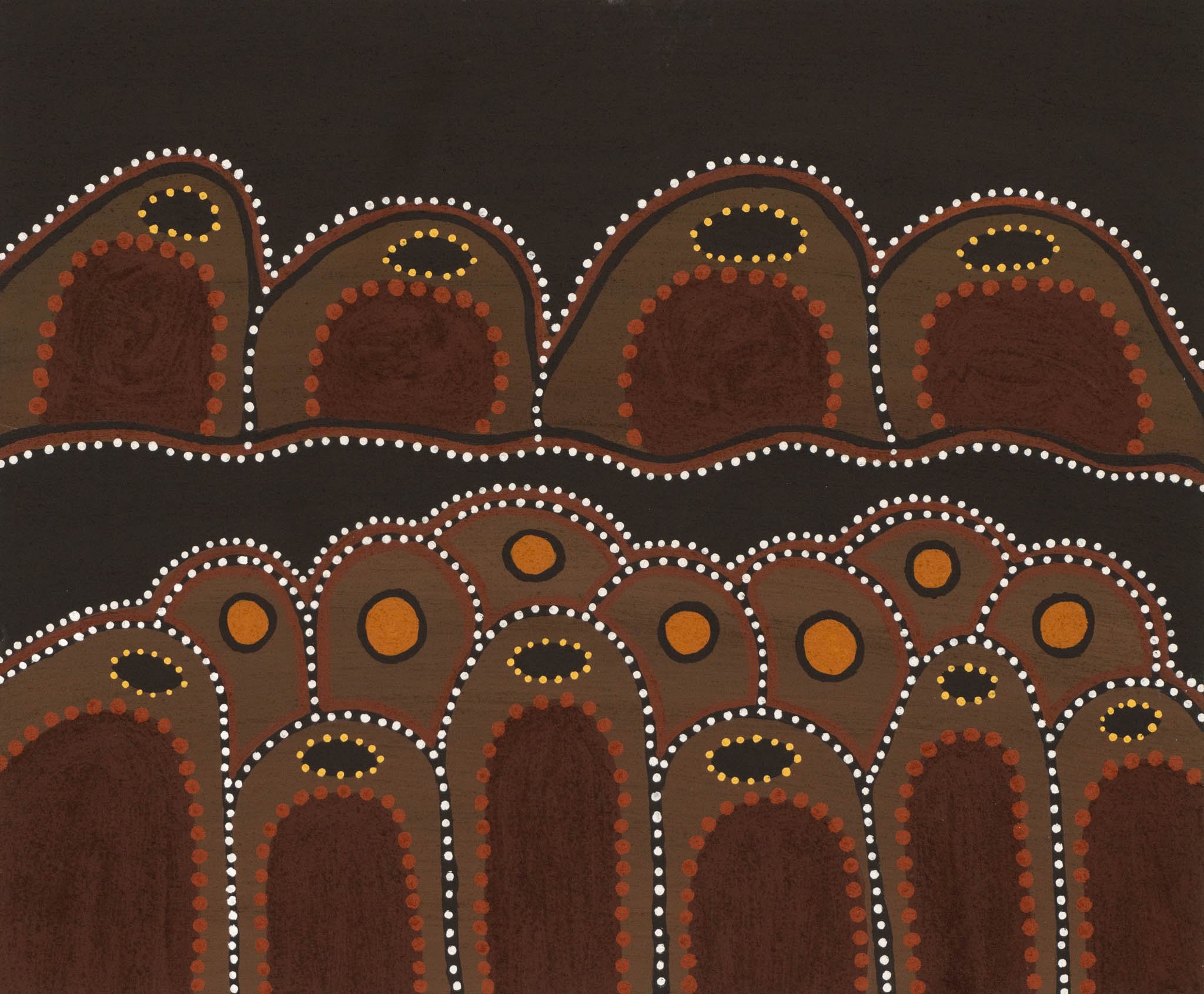 June paints both in the typical Warmun style (thick bulked ochre), as well as fine, detailed works in minimal palette and on occasion, wonderful works using the acrylic medium. June’s work has been quickly noticed and purchased by astute collectors and included in exhibitions at Australian galleries such as Japingka Gallery in Perth and Harrison Galleries and Gallery Tjukurrpa in Sydney plus international galleries in France, The Netherlands and USA.