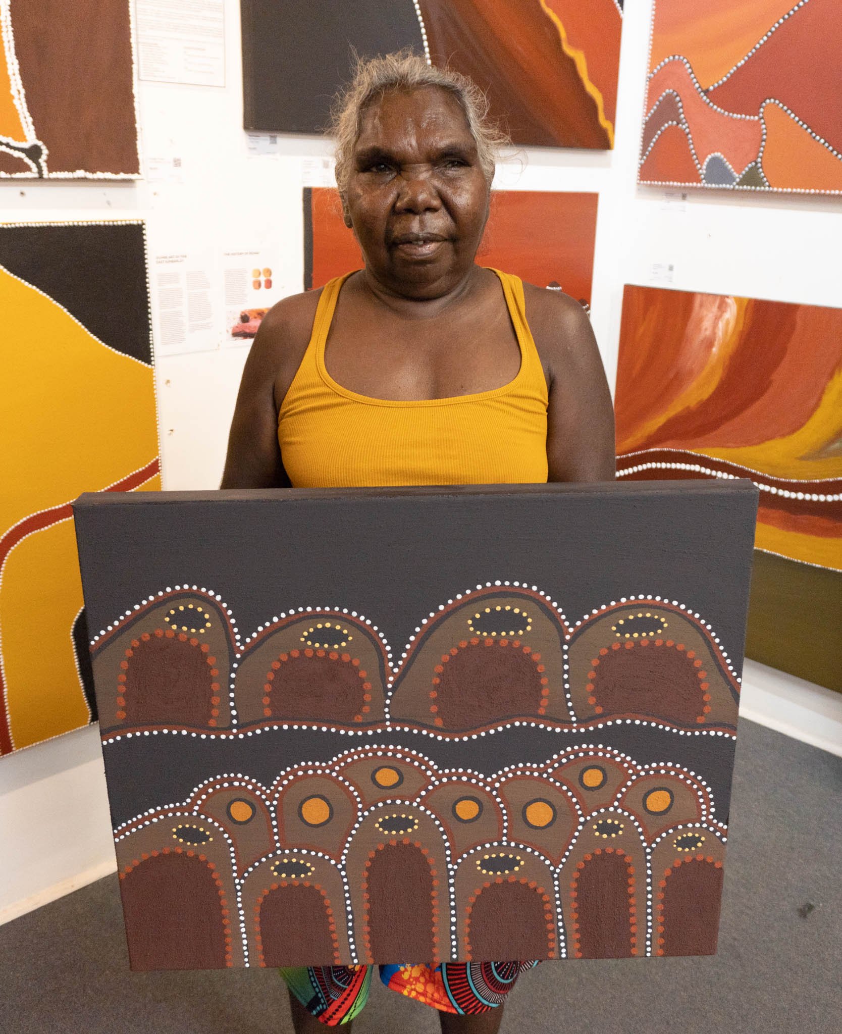 She was taught painting from an early age by the best of our famous first generation ochre artists, including Jack Britten, Madigan Thomas and Lena Nyadbi. These Elders devoted their lives to teaching youngsters culture, Traditional Dreamtime stories and ochre painting technique.