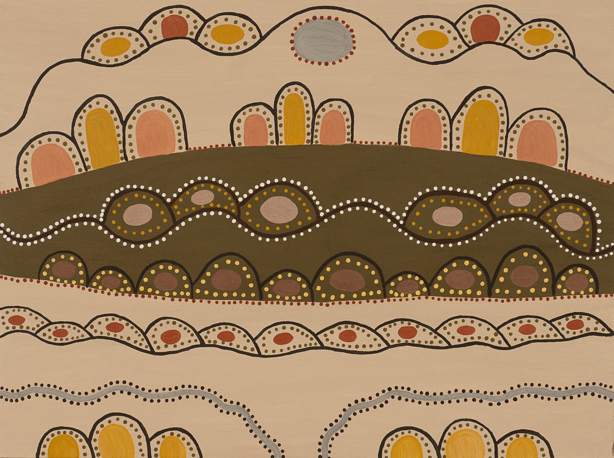 I have painted my family’s country, Texas Downs (Ngarrgaroon), on the eastern side near Purnululu. The hills are a little bit bigger on Texas than in the Bungle Bungles. The hills to the north are called Red Butte Country. There’s always water from the tributaries of the Ord and not far from this place is Fish Hole which has water all year round. It’s not too far from Turkey Creek (where June’s family resides), so I can take my grandchildren there for swimming. That’s one of my favourite places on Texas Downs.