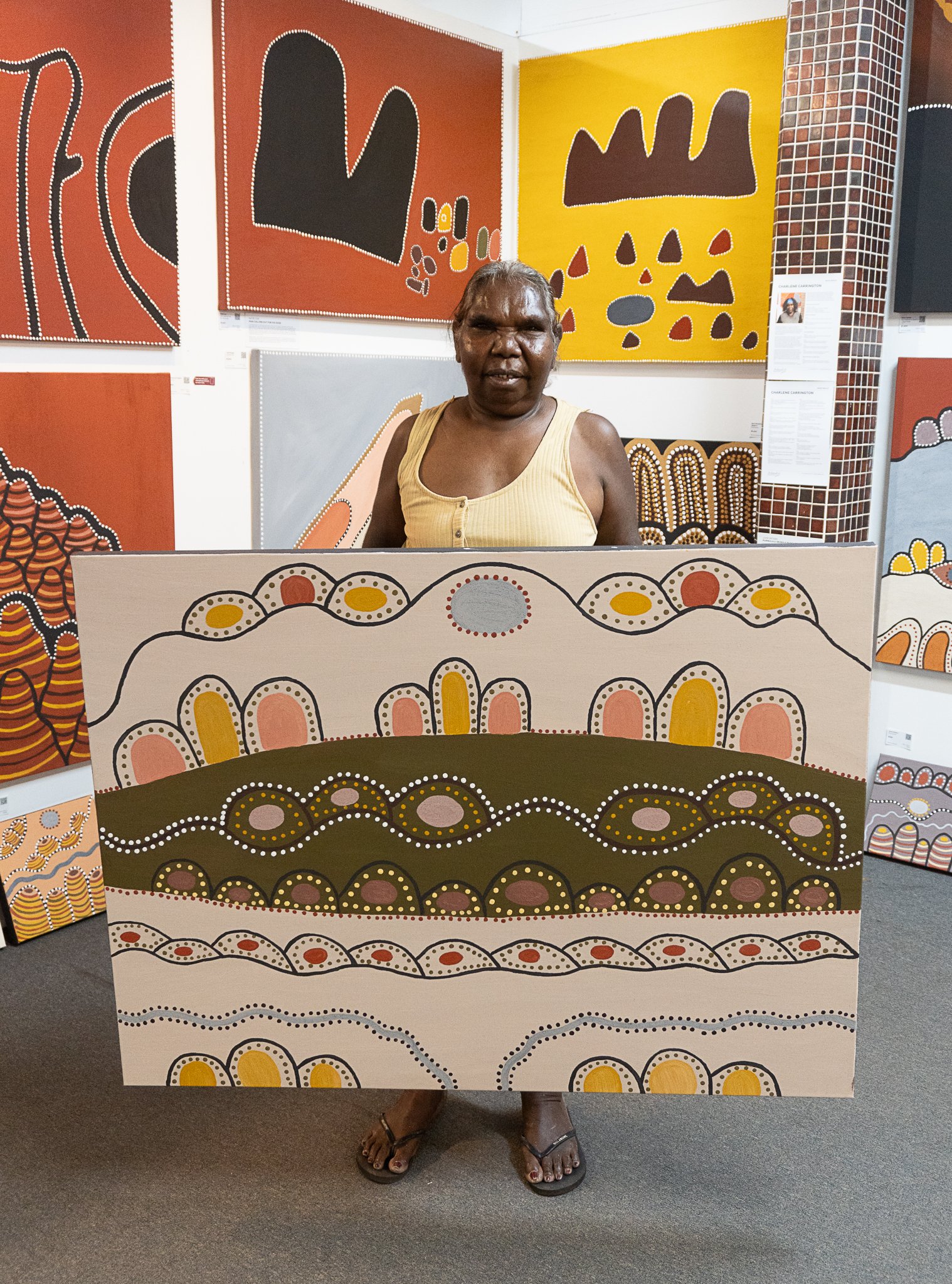 She was taught painting from an early age by the best of our famous first generation ochre artists, including Jack Britten, Madigan Thomas and Lena Nyadbi. These Elders devoted their lives to teaching youngsters culture, Traditional Dreamtime stories and ochre painting technique.