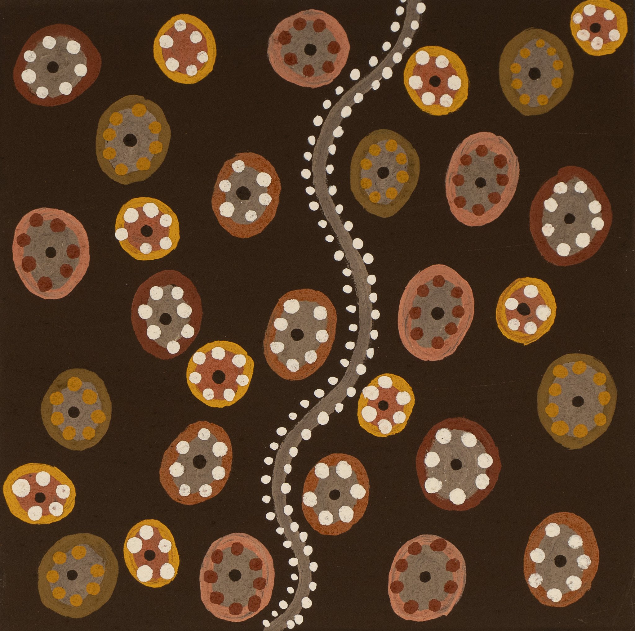 June paints both in the typical Warmun style (thick bulked ochre), as well as fine, detailed works in minimal palette and on occasion, wonderful works using the acrylic medium. June’s work has been quickly noticed and purchased by astute collectors and included in exhibitions at Australian galleries such as Japingka Gallery in Perth and Harrison Galleries and Gallery Tjukurrpa in Sydney plus international galleries in France, The Netherlands and USA.