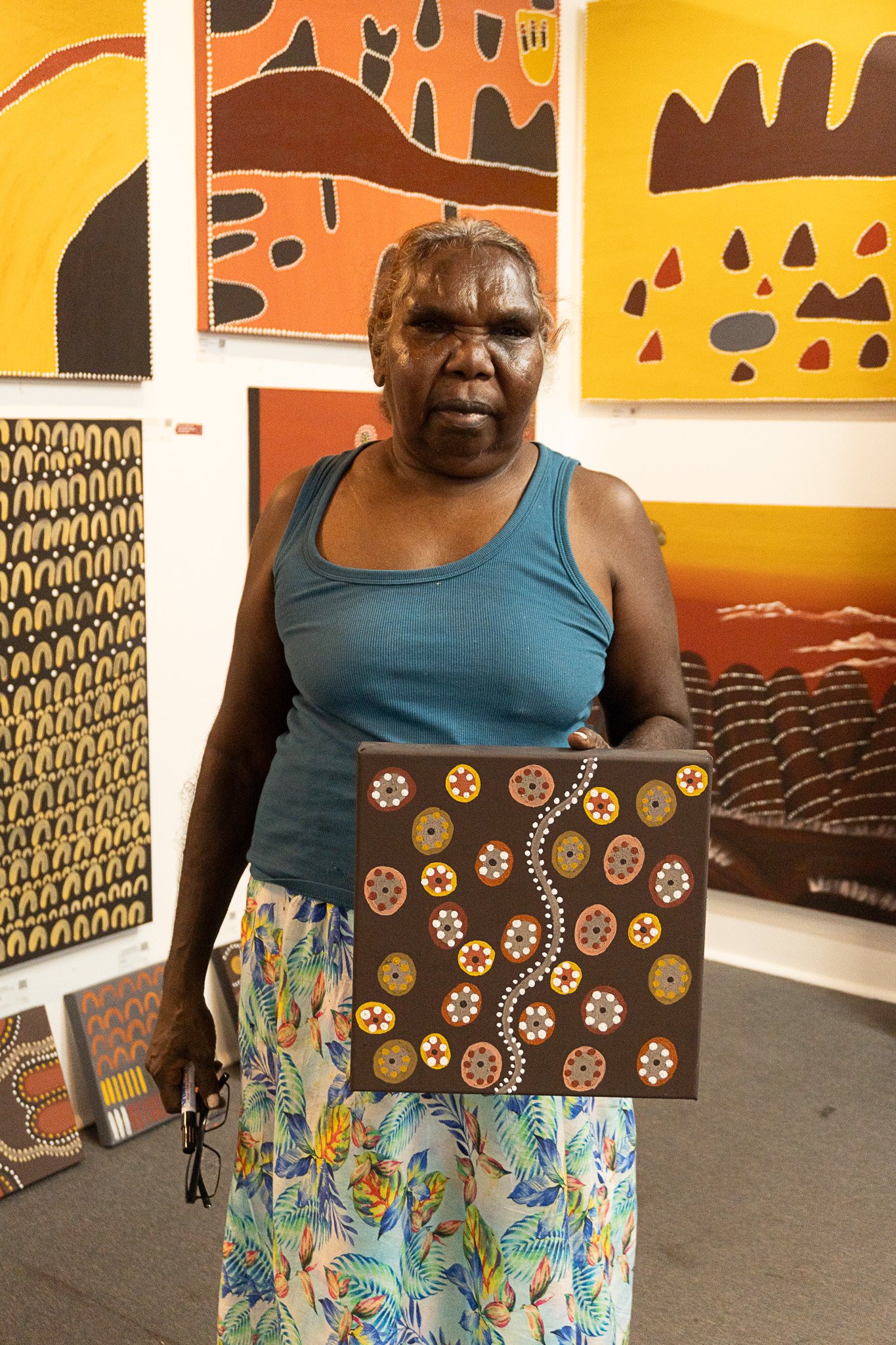 She was taught painting from an early age by the best of our famous first generation ochre artists, including Jack Britten, Madigan Thomas and Lena Nyadbi. These Elders devoted their lives to teaching youngsters culture, Traditional Dreamtime stories and ochre painting technique.