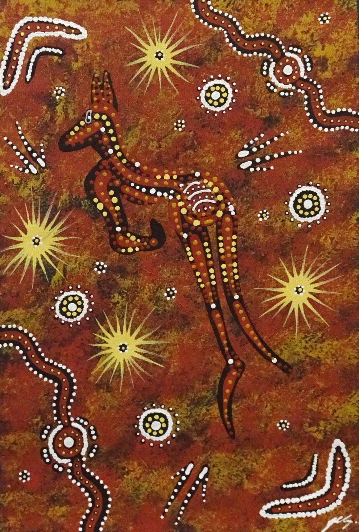 The animals and reptiles that Justin paints in his artworks are totemic spirits and the Central / Western Desert Aboriginal artists paint their Dreamings to honour their ancestral spirits. The Kangaroo has found a waterhole and is taking the opportunity for a much needed drink. The “star bursts” represent the Spinifex which is found throughout Justin’s desert country and the small roundels are the wildflowers that emerge in a burst of colour from late July to early September.