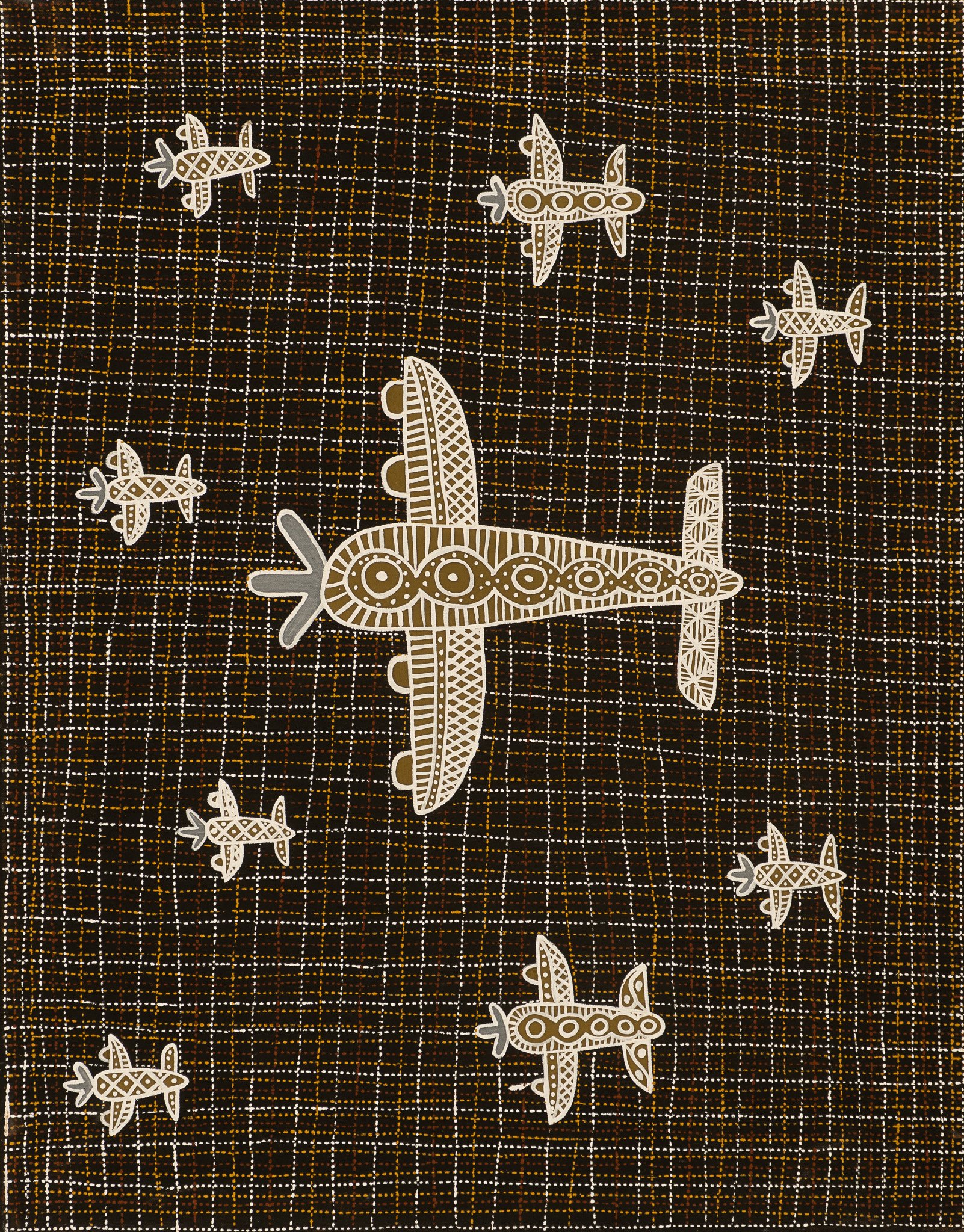 After the first bombing, the men thought of making songs and dance about the bombing and the planes. This painting is about that. One old man singing, while men, women and kids dance around. Some people, when the bombing started, were standing around or hunting with their spears, when the bombing started they were throwing their spears to the plane and hiding to try to keep safe.
