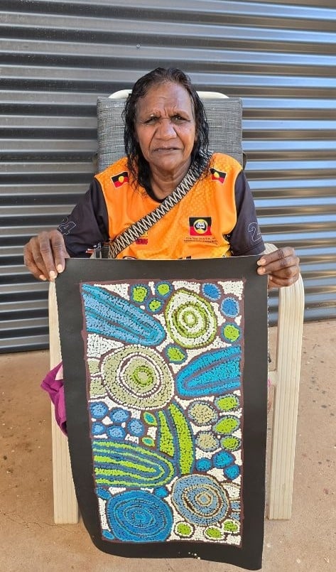 Striking colours and heavy dot work are used to depict the sacred women’s ceremony which is held at the site of Tjintjintjin, located 250km west of Katherine’s birthplace.