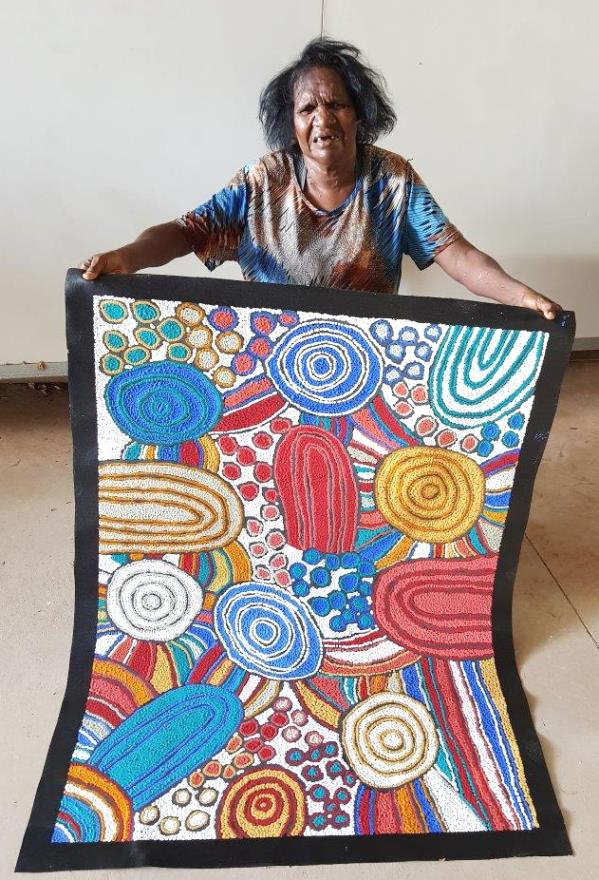 Similarities can be seen between Katherine’s work and the bold style of the Papunya Tula movement. This is especially evident in the way the paint is applied in thick, joined dots. Katherine has developed her own palette of colours and her personal way of representing the iconography to depict the traditional sacred women’s sites in the Kintore area, located 250km west of her birthplace.