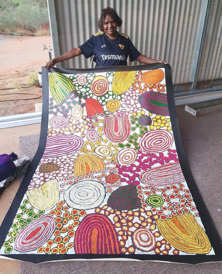 Striking colours and heavy dot work are used to depict traditional sacred women’s sites in the Kintore area, which is located 250km west of Katherine’s birthplace. The concentric circles commonly seen in her paintings represent the important ceremonial sites for Katherine and her ancestors and the connecting lines between the circles are the ancient travelling paths that lead to these sites. These were established as an indicator for the passage from one site to the next during ceremony.
