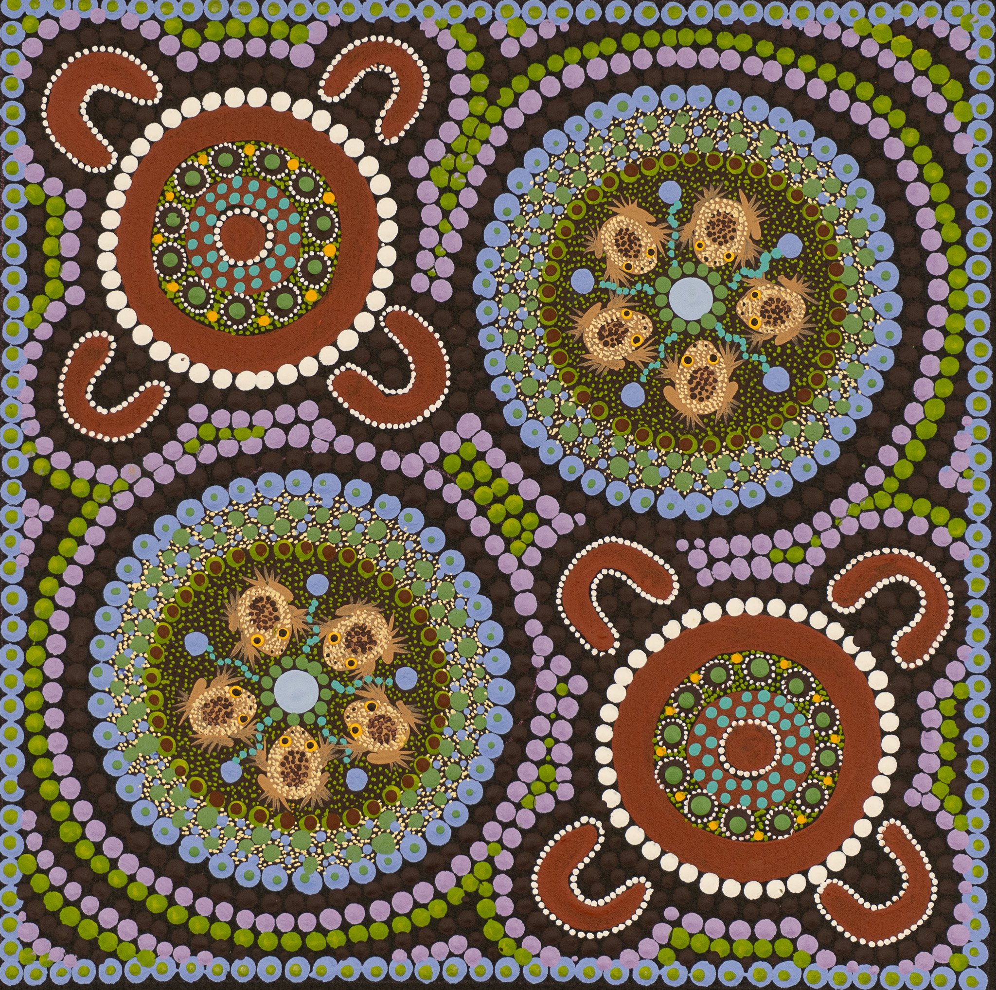 Kathleen’s fine Central Desert Dot Painting style celebrates her discovery and connection to her indigenous heritage.