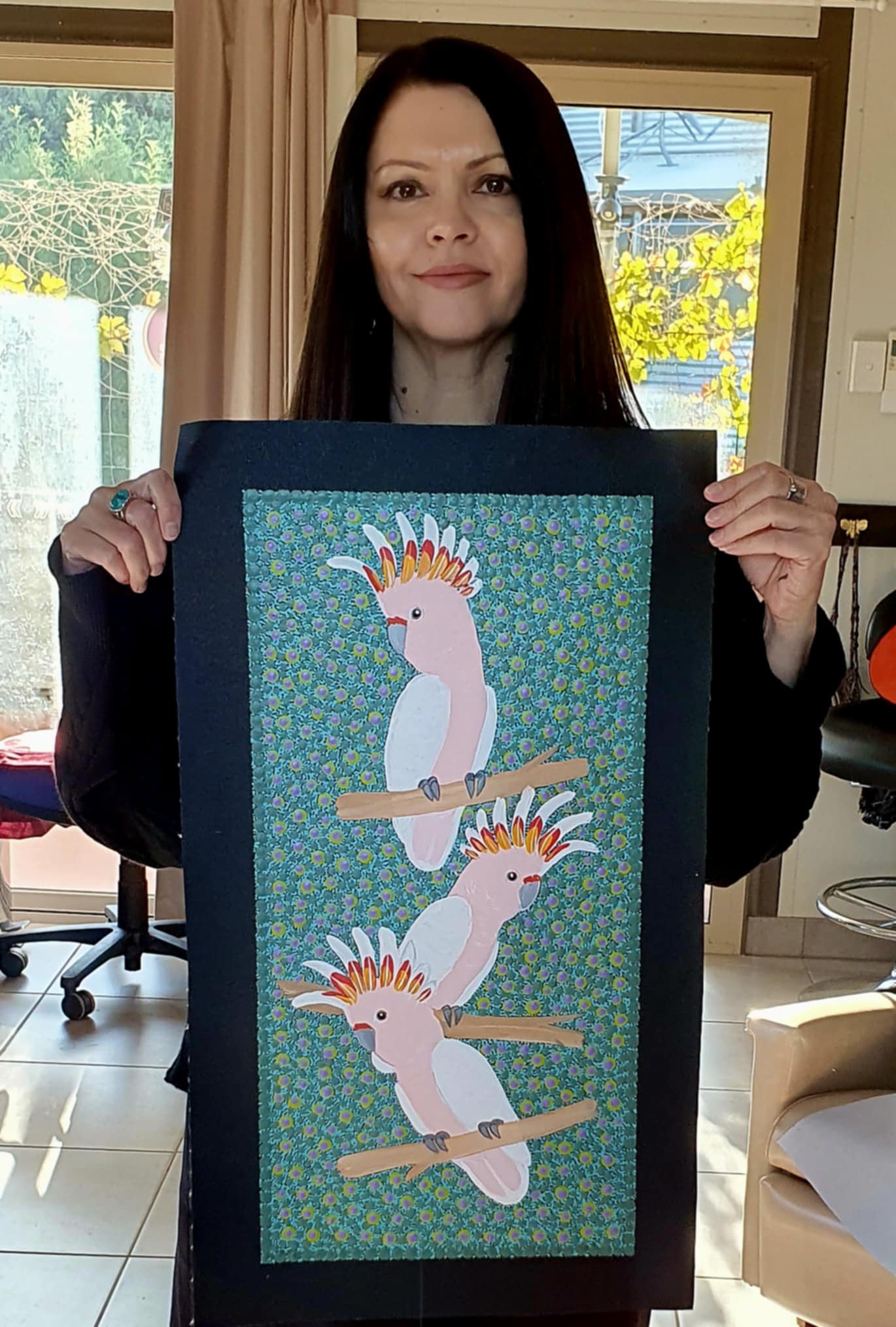 Kathleen is renowned for her finely detailed depictions of Central Australian birds — from the striking Red-tailed Black Cockatoos, Sulphur-crested and Major Mitchell Cockatoos, to the gentle Boobook and Barn Owls, playful Galahs, and the tiny Zebra Finches, Green Budgies, and Fairy-wrens.