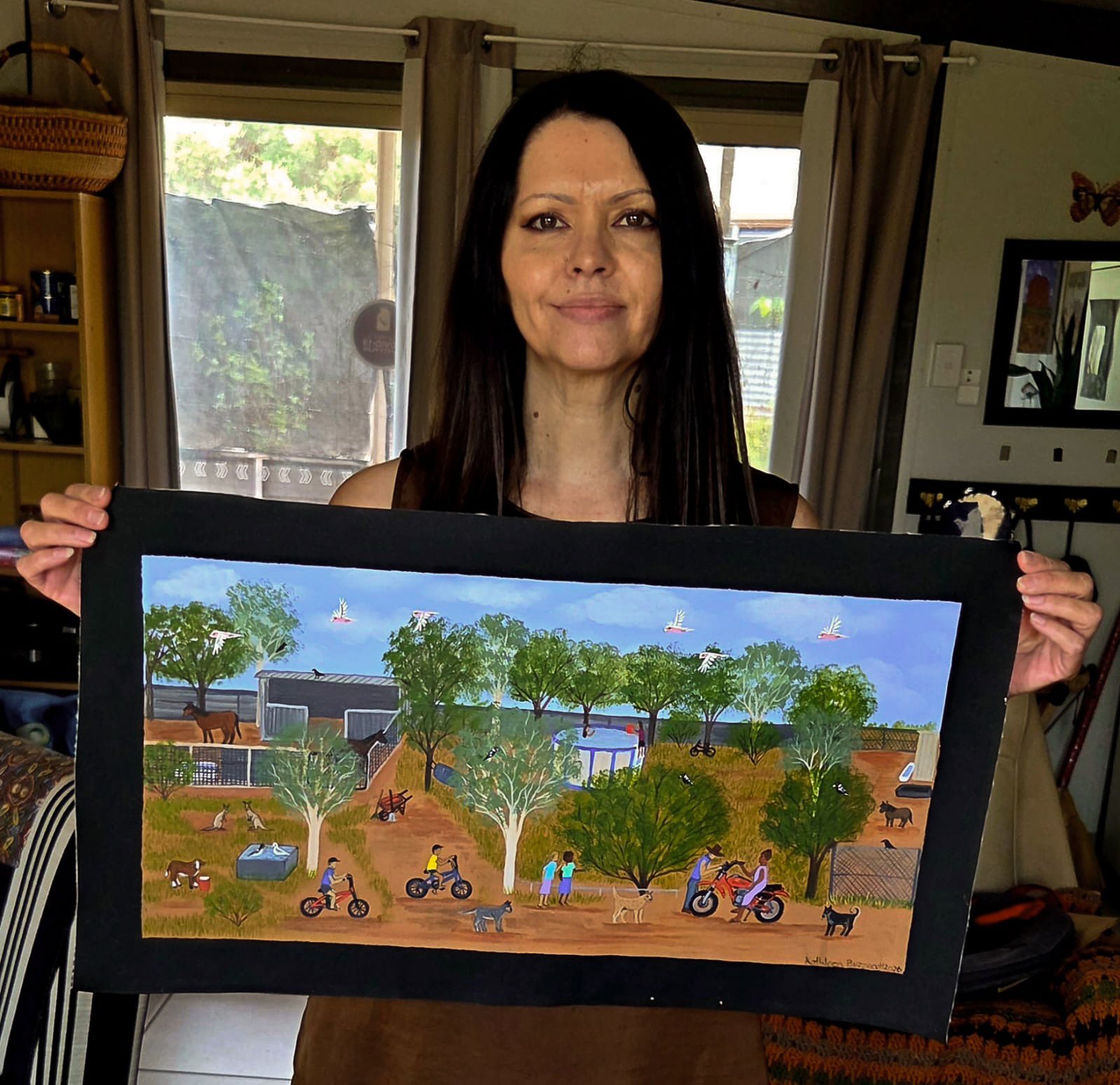 This series is Kathleen’s loving tribute to her childhood in Hermannsburg (Ntaria) — a life full of colour, family and bush adventures. From spring wildflowers and swimming days to horse parades, picnics after the rain, and digging for sweet honeyants, each piece captures a treasured memory from Western Arrernte Country. Together, they form a heartfelt portrait of growing up in a close-knit desert community.