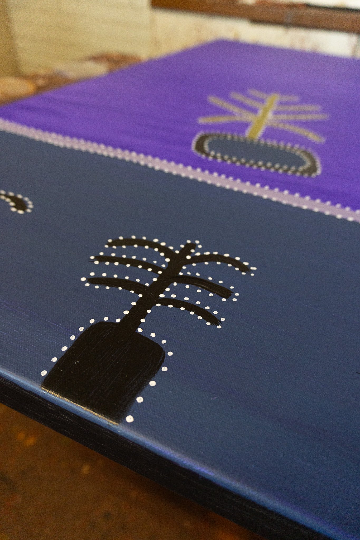 Using both acrylic paint and natural ochre earth pigments, Kathy combines traditional and contemporary techniques to capture the essence of Warlawoon. The strong linear forms and dotting patterns echo her father’s distinctive style while also reflecting her own artistic voice. Each painting stands as a celebration of family, Country, and the enduring bond between past and present.