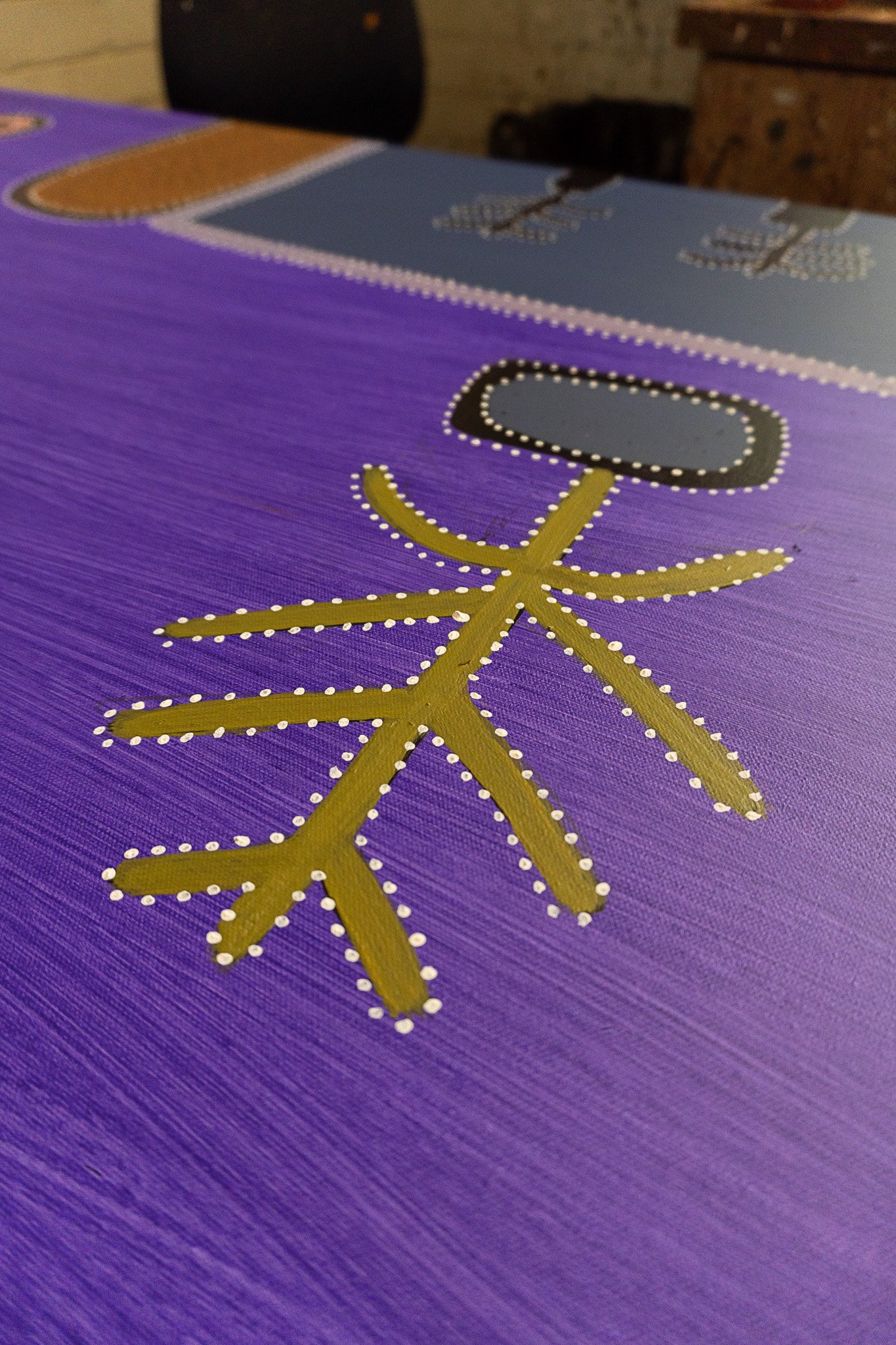 At the top of the painting sit four U-shapes, symbolising four generations connected to this Country — Kathy’s parents, her own generation, her children, and her grandchildren. Even though her parents are no longer here, their presence continues through the generations who walk this land today, keeping culture, memory and connection alive.