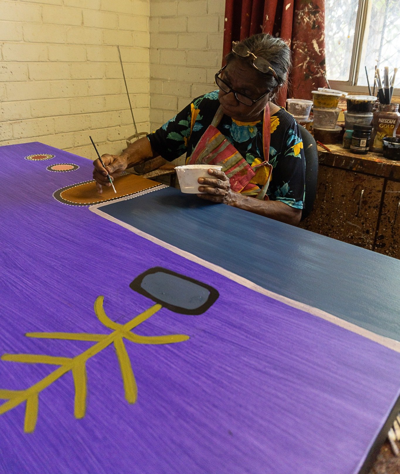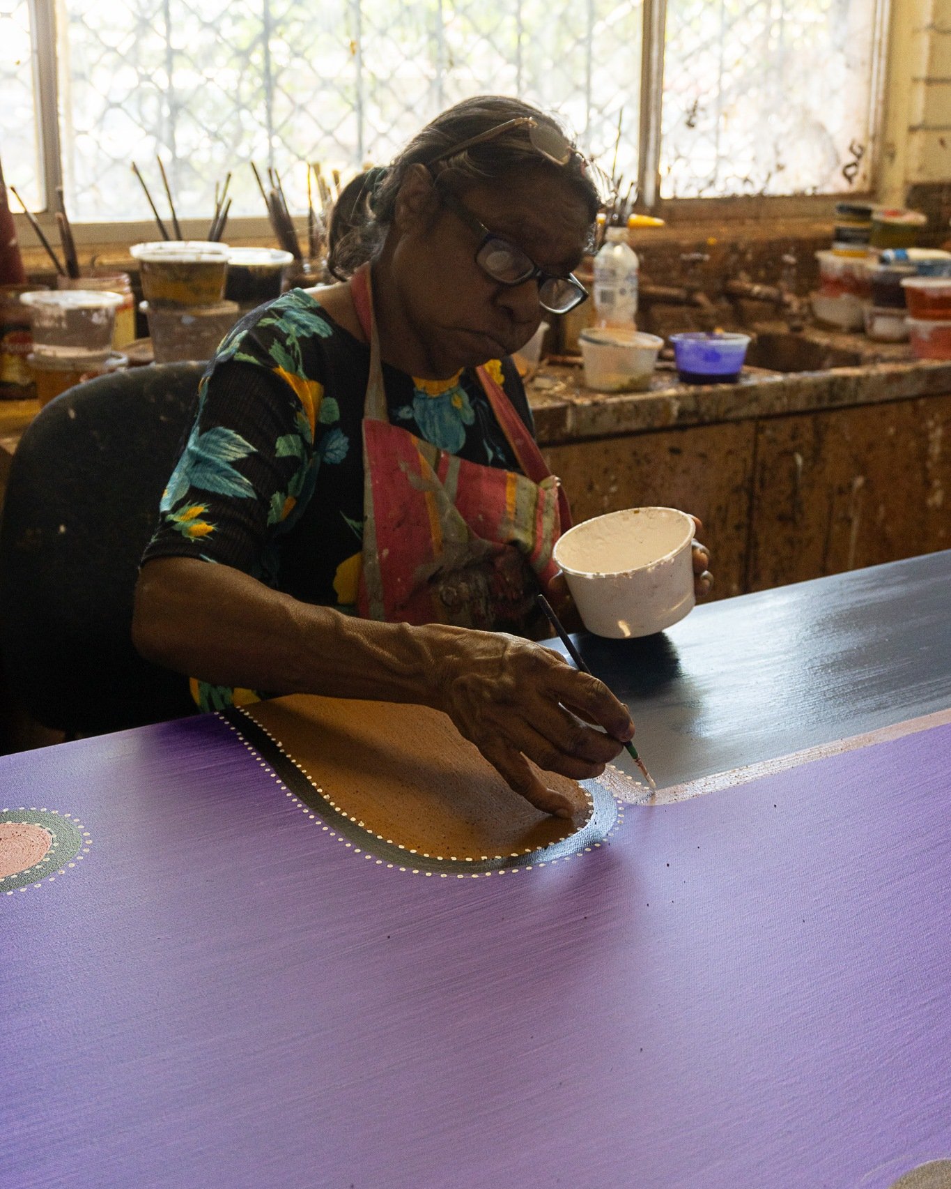 Kathy Ramsay paints Warlawoon Country, the traditional lands of her late father, senior Gija artist Rammey Ramsey. Located between Bedford Downs and Tableland Stations in the East Kimberley, this Country is rich with ancestral stories, natural features, and family history that has been passed down through generations.