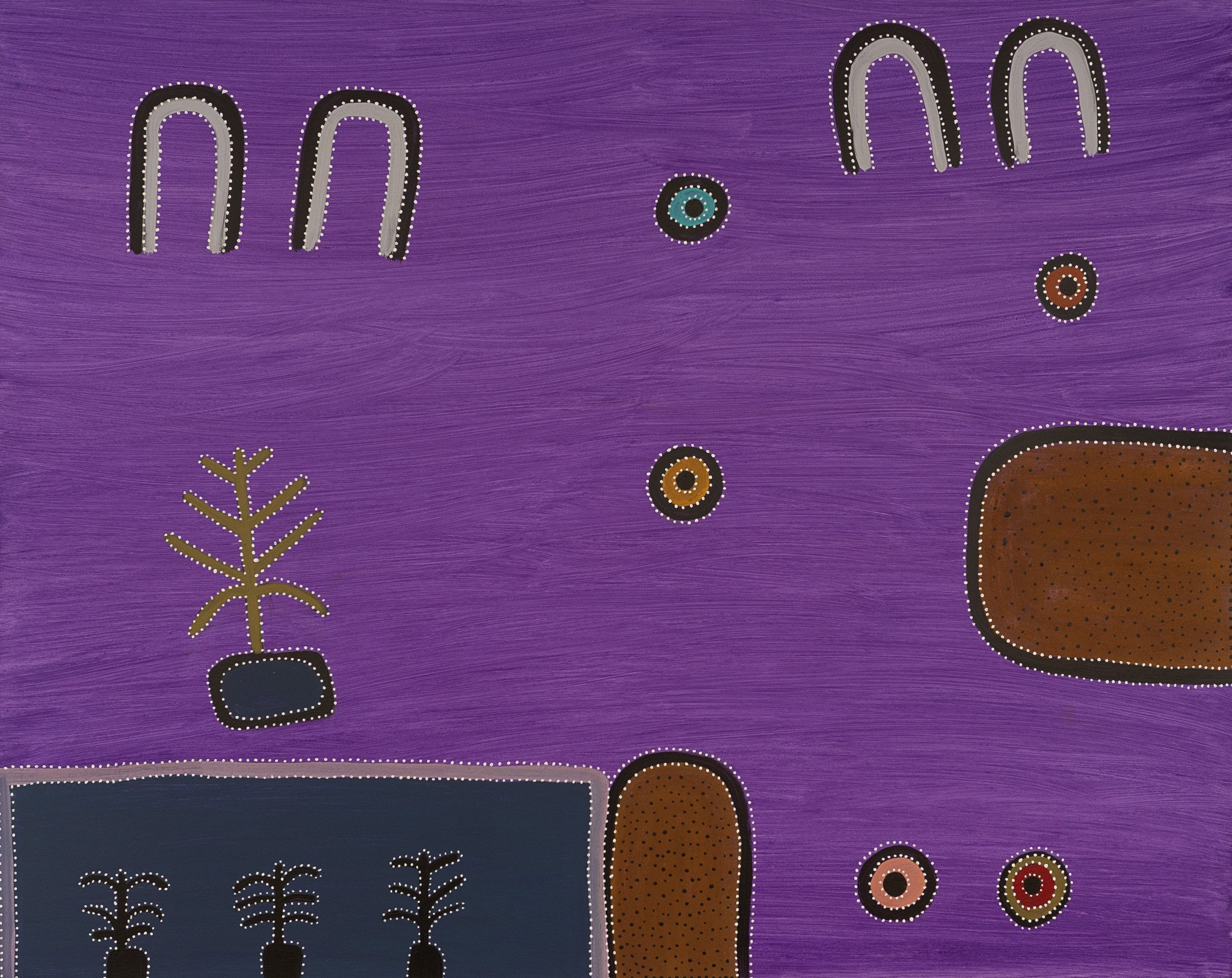 In these works, Kathy depicts elements of her father’s Country — the hills, waterholes, trees, campsites and more. Her paintings honour his memory and the knowledge he shared about their land, its significant places and its history.