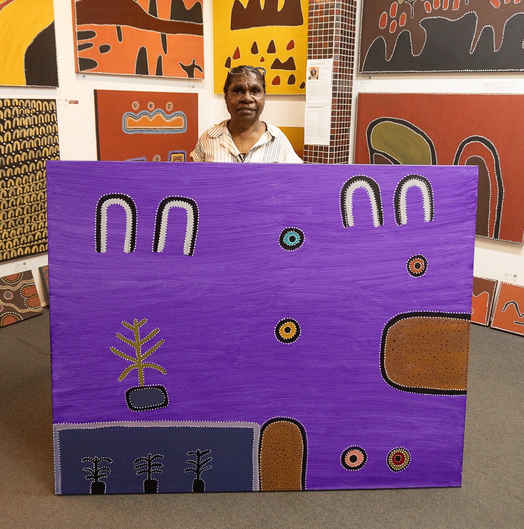 Through her own work, Kathy continues this extraordinary family tradition — celebrating the stories, spirit, and landscape of the East Kimberley. Her paintings stand as a tribute to the generations before her and as a vibrant continuation of her family’s enduring cultural legacy.