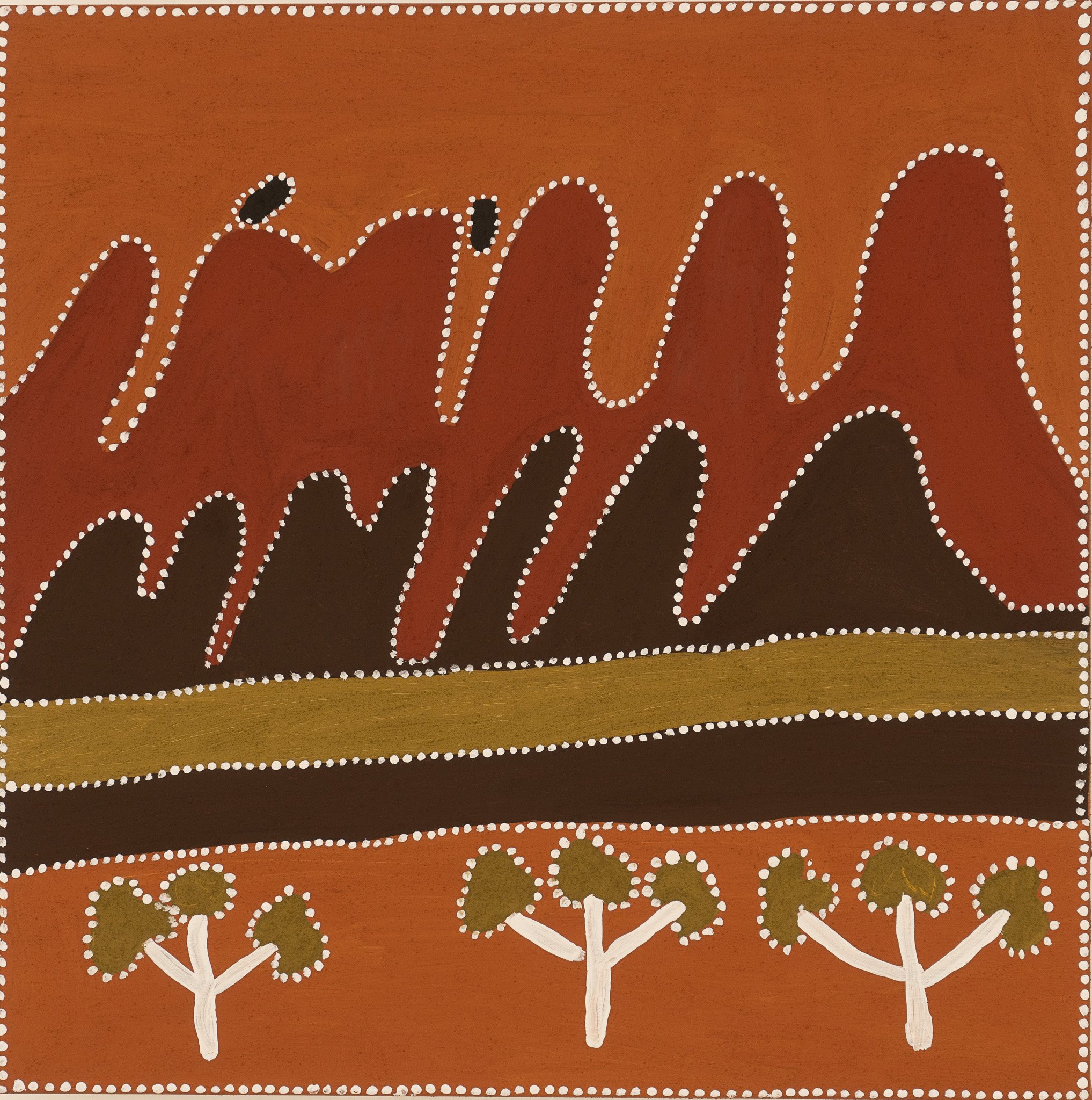 This story happened in the dreamtime (Ngarrangkarni). Eagle and Crane went hunting for rock wallaby. They found some on top of a cave (shown here in the middle of the painting in brown). Eagle told crane, ‘I’ll get them and throw them down to you.’ While eagle was on top of the cave, he got each rock wallaby and kept the fat ones for himself and gave the little skinny ones to the crane. Next they went down to the creek to cook up their wallabies. Eagle sat upstream and crane sat down stream. Crane said to eagle, ‘Let’s go look for ground sugarbag while we wait for these wallabies to cook.’ They found a cave and crane said to eagle to go in and get the wild honey: ‘Go in more, go in more,’ said the crane. So eagle went in more and more, and them crane blocked the opening with spinifex grass and lit the grass. Crane went back to the river and ate all of eagles fat wallabies. The eagle found another way out of the cave. He too went back to the river, but this time he cleared a place next to the river, but he also put a sharp stick in the ground and then called over crane to come and talk in this nice clean spot. Crane came over and sat down, right on top on the sharp stick. He cried out, the noise that we know today as a crane’s call. The Eagle flew off making his bird call.