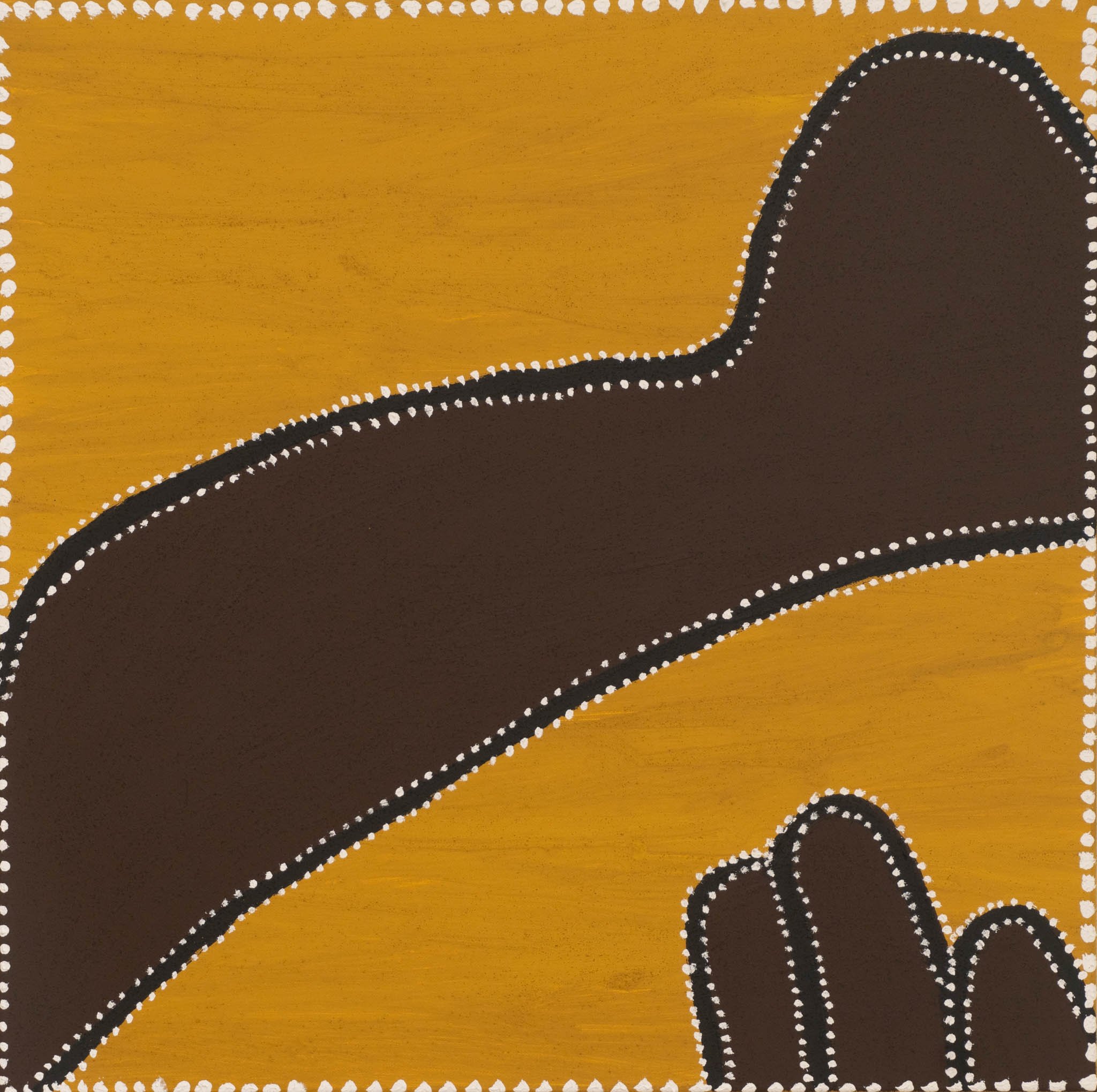 I have painted a place on Texas Downs Station which is my family’s country. It is south of Red Butte Country going towards Station Creek. In this area, the old people (the women) would collect sugarbag (wild honey) which was a staple part of their diet. It gave them energy and we still eat it today when we go camping. Any place that had lots of sugarbag was a very important place. The large hill was called Sugarbag Hill, and the sugarbag was collected all around this place.