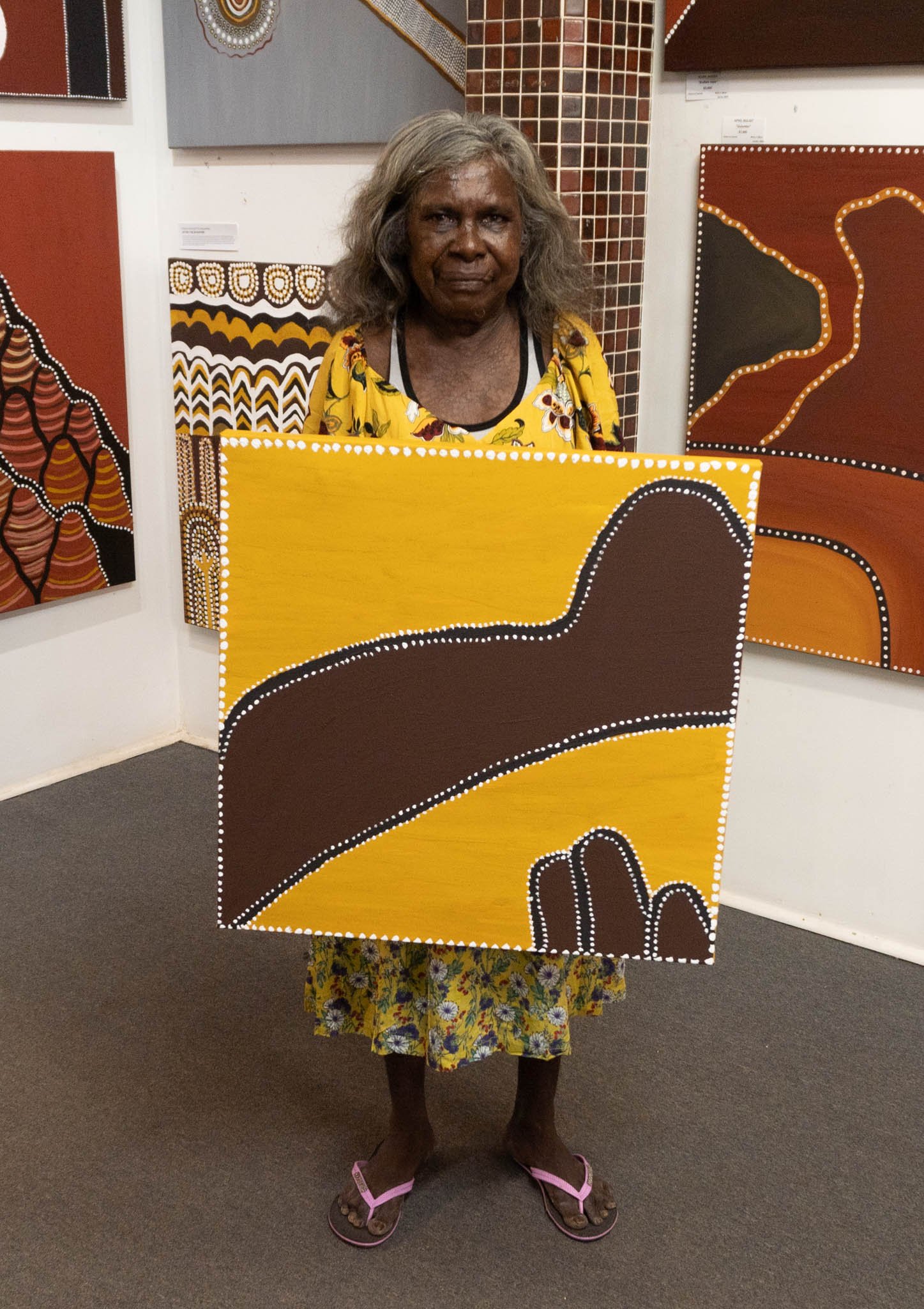 Katie comes from a family of talented artists – her aunts Lena Nyadbi and Goody Barrett introduced her to painting, and she was encouraged by her brother, International Artist Churchill Cann, and other established artists. Her husband is renowned artist, Tommy Carroll.