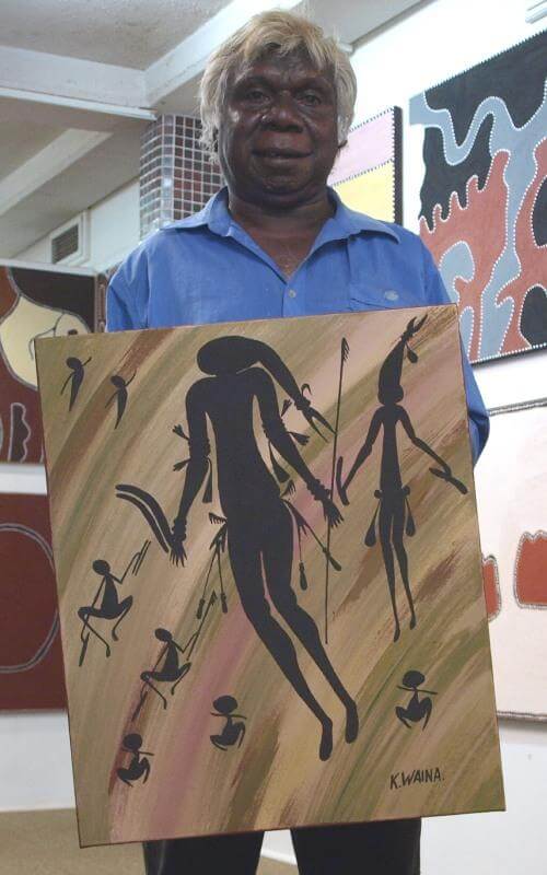 Kevin visited Kununurra regularly to paint “in house” at the gallery plus he never missed coming down for the Melbourne Cup and Christmas Shopping with his wife. He travelled extensively throughout Australia and Overseas – including leading a contingent of indigenous people to Rome to visit the Vatican. When asked why he was chosen as the leader, he laughingly replied “Because if we got lost, I’m the only one cheeky enough to ask the way home”. Kevin was delightful company – he described the Colosseum as “much smaller than I expected”, then went on to compare it with an Australian Rules Football oval – he paced out the Colosseum and knew exactly how many paces that equalled as to the Football oval.