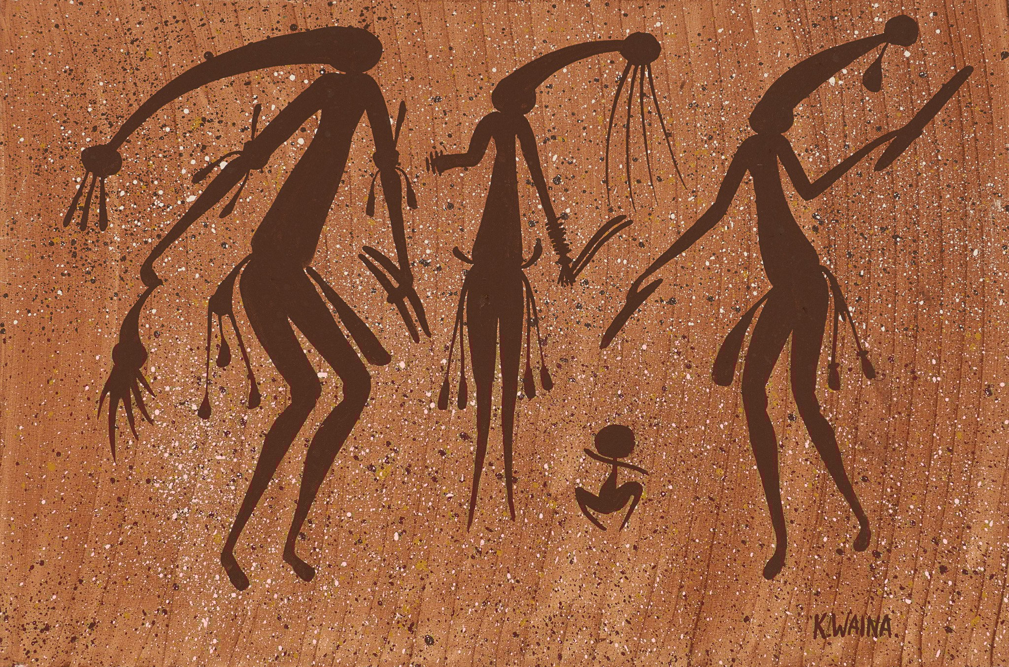 Kevin Waina was born in Wyndham in 1954 and spent most of his life in the remote coastal community of Kalumburu in the far north of the East Kimberley. He and his wife Bernadette raised seven children, with their three eldest—Cassandra, Melissa, and Lawrence—inheriting their father’s artistic talent. Bernadette is also well known in her own right for her traditional artefacts, particularly her bush buckets crafted from moulded bark, which are now sought-after collector’s items.