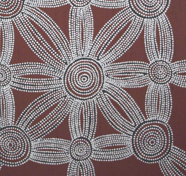 The artist has painted her family’s desert country around Sturt Creek, depicting the tracks along which the women would travel to the soakages (desert waterholes) for Women’s Ceremony and Law. The young girls were taught how to become women and take their place in the tribe, whilst the Elder women would discuss the Law for their tribe. These ceremonies normally take place in June/July and the colours of Kitten’s country at this time of the year are reflected in the artwork. Still plenty of waterholes (with minimal water) and the land already devoid of any sign of grass, with the Wet Season well and truly over. The dotted roundels are representative of secret Women’s sites visited during the travels.