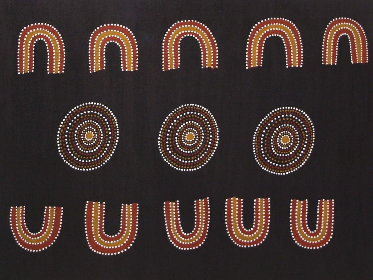 Her Grandmother’s country was Sturt Creek/Gordon Downs area and Kitten (really Kathleen and sometimes Kitty she says and laughs) paints this country as well as Halls Creek area. She and her three brothers moved to Ord River Station and it was there that Kitten commenced her working life. She was a camp cook, worked around the homestead until she returned to Halls Creek.