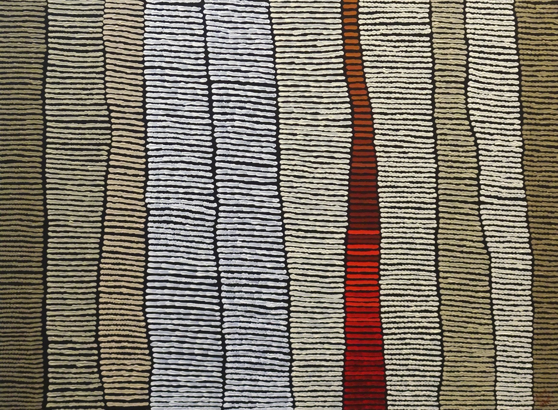 As well as being a senior artist, Kurun Warun is an Internationally acclaimed didgeridoo player, having played around the world and being featured on the Oprah Winfrey Show filmed at the Sydney Opera House. In this artwork, he combines his talents, painting his beloved “Yidaki” – Didgeridoo, on canvas.