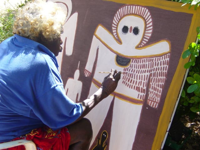 Lily is one of Australia’s most important contemporary aboriginal artists. Whilst she varies her subject matter, she has never compromised on style. Lily’s paintings are instantly recognisable. Lily paints Wandjina – with varied totems, rain dotting, lightning (Black Wandjina), turtles, cave pools with bubbles – all different but all Lily Karadada.