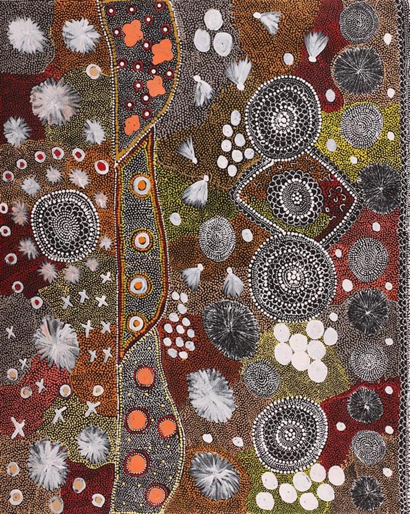 Lola has been painting with Warlukurlangu Artists since 2002 where she works on her Water Dreaming stories. They recount stories about the land and its structures. These chronicles were passed down by her grandmother, mother, aunty and their parents before them as part of Aboriginal tradition.