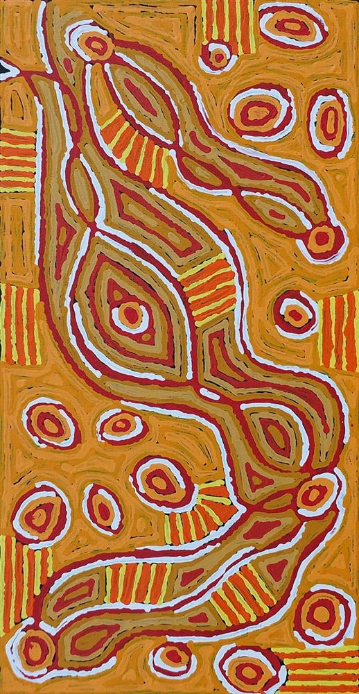 Mina Mina is the area or country this painting is depicting. It is far west of Yuendumu and is very important to the Napangardi/Napanangka women. These women and their Japangardi/Japanangka brothers, are the custodians of the Jukurrpa that created the area. This story (Dreaming) tells of the journey of a group of women who travelled east gathering food, ngalyipi‟ (snake vine) and performing ceremonies as they journeyed. The ‘ngalyipi’ vine grows up the trunks and branches of the ‘kurrkara’ (desert oak trees. ‘Ngalyipi’ is a sacred vine to Napangardi and Napanangka women that has many uses. It can be used as a ceremonial wrap, as a strap to carry ‘parrajas’ (wooden bowls) that are laden with bush tucker and as a bandage for headaches.