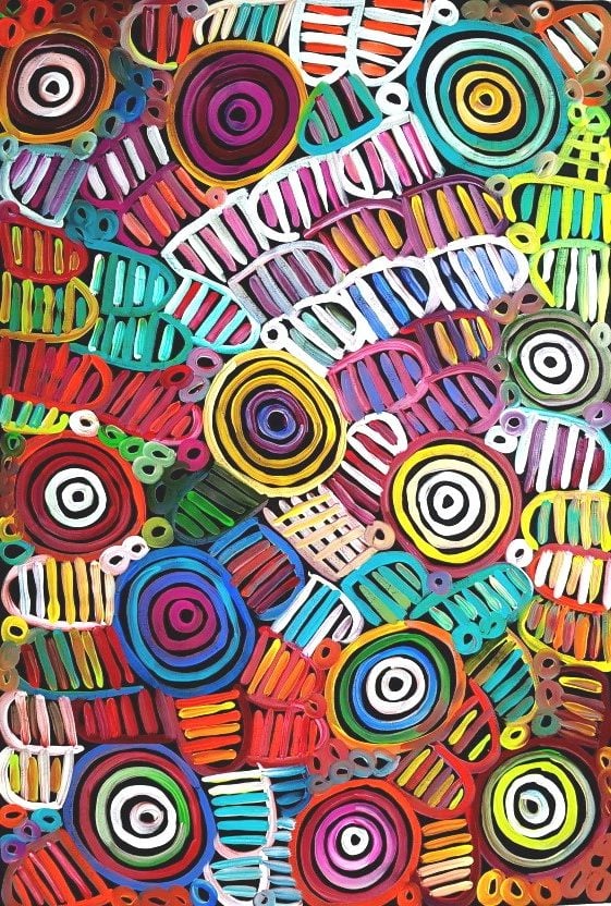 This painting depicts the various ceremonial sites, the bush melons and the women’s breasts which are painted with body paint designs.