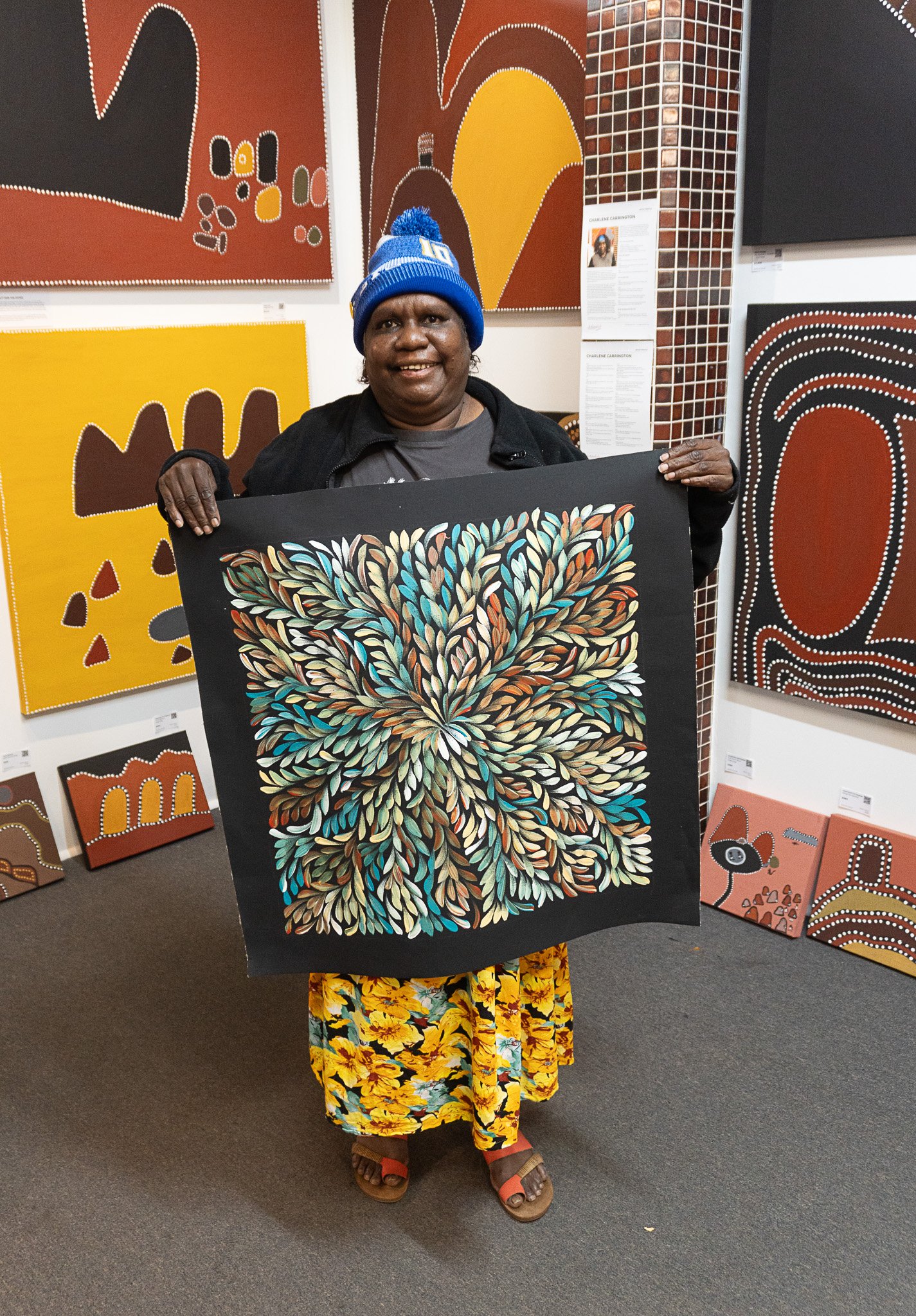 Louise’s family come from a long line of desert artists of the contemporary Aboriginal art movement including her world renowned aunties, the late Gloria and Kathleen Petyerre. Many women from the Petyerre, Mbtitjana and Numina family name hold custody and are knowledge keepers of stories such as Bush Medicine Leaves, Bush Tucker, Seeds, Soakage and Womens’ Ceremony, in common with other skin groups across the vast arid landscape and desert areas of central Australia.