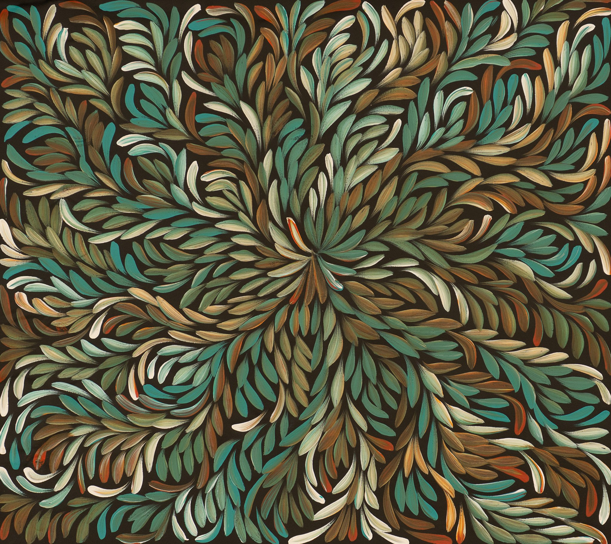 The Bush Medicine Plant is an Australian native that grows wild in Central Australia. Women collect leaves from these plants, which are boiled to extract resin. Kangaroo fat is mixed into the resin, creating a paste that can be stored for a long time in bush conditions. This medicine is used to heal cuts, wounds, bites and rashes. It is also used to treat the flu, headache, backache, upset stomach, chest pains or as an insect repellent. As the leaves and petals dry out they fall off and are blown around by the wind. This is represented in the painting and gives it the movement.