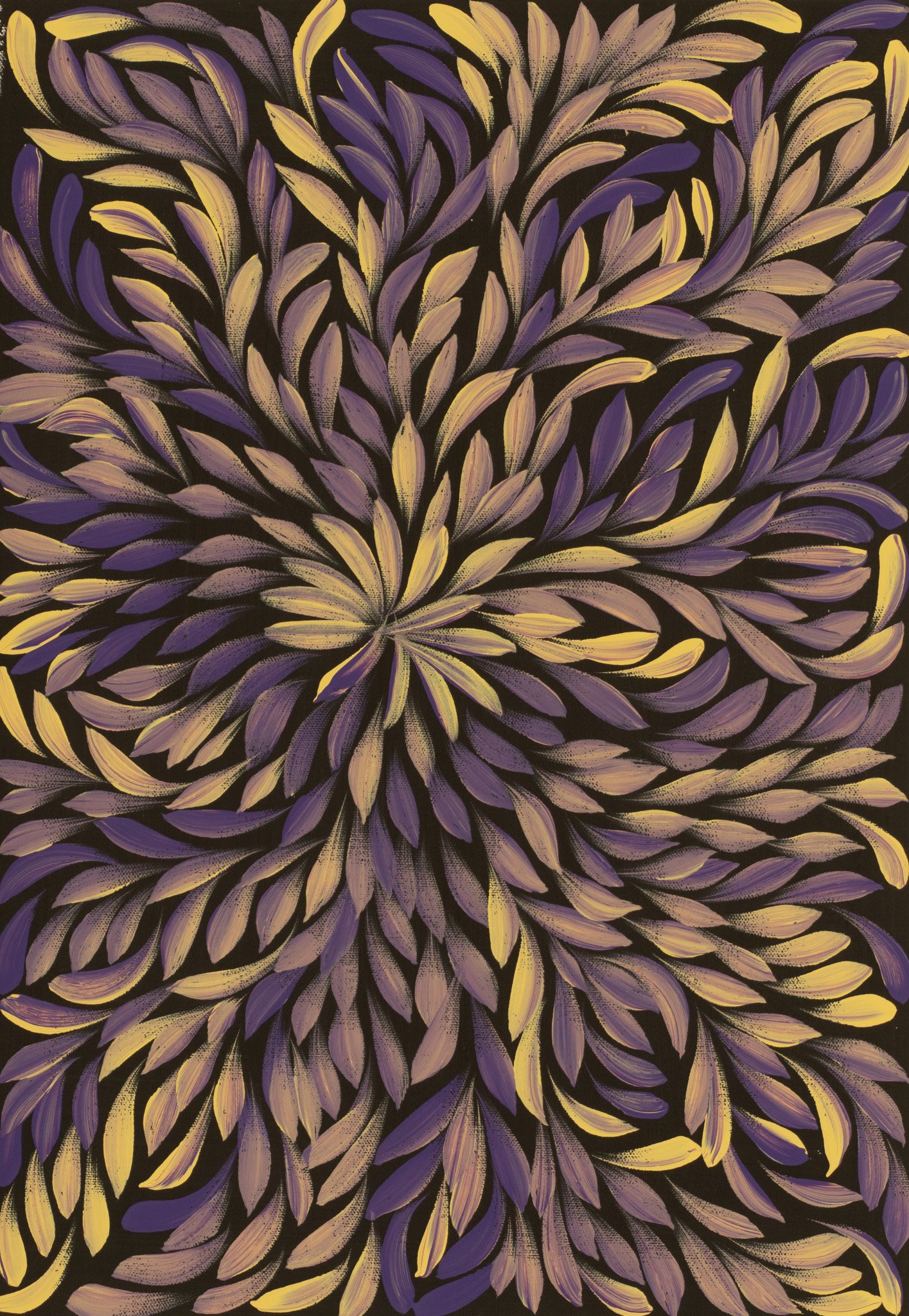 The Bush Medicine Plant is an Australian native that grows wild in Central Australia. Women collect leaves from these plants, which are boiled to extract resin. Kangaroo fat is mixed into the resin, creating a paste that can be stored for a long time in bush conditions. This medicine is used to heal cuts, wounds, bites and rashes. It is also used to treat the flu, headache, backache, upset stomach, chest pains or as an insect repellent. As the leaves and petals dry out they fall off and are blown around by the wind. This is represented in the painting and gives it the movement.