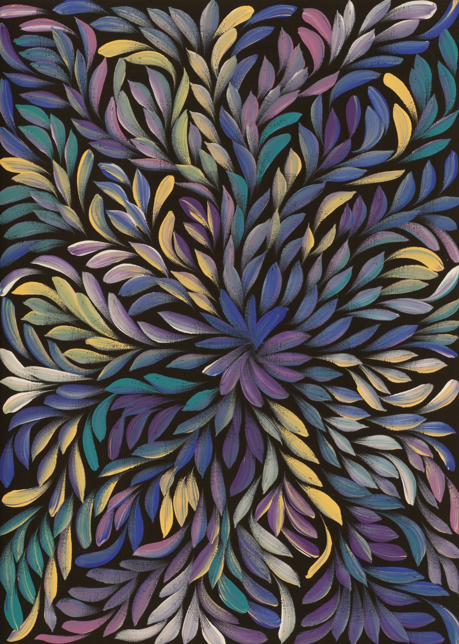 The Bush Medicine Plant is an Australian native that grows wild in Central Australia. Women collect leaves from these plants, which are boiled to extract resin. Kangaroo fat is mixed into the resin, creating a paste that can be stored for a long time in bush conditions. This medicine is used to heal cuts, wounds, bites and rashes. It is also used to treat the flu, headache, backache, upset stomach, chest pains or as an insect repellent. As the leaves and petals dry out they fall off and are blown around by the wind. This is represented in the painting and gives it the movement.