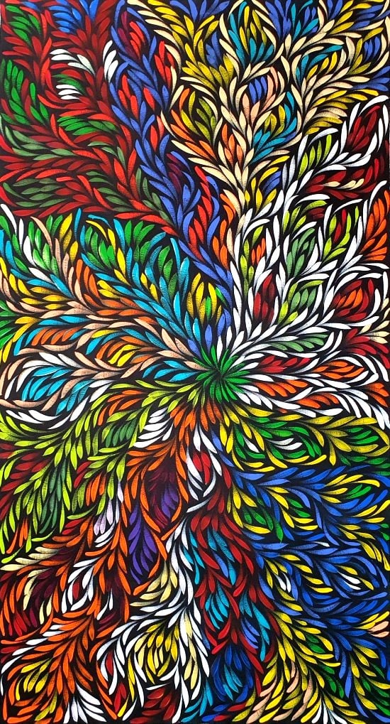 The Bush Medicine Plant is an Australian native that grows wild in Central Australia. Women collect leaves from these plants, which are boiled to extract resin. Kangaroo fat is mixed into the resin, creating a paste that can be stored for a long time in bush conditions. This medicine is used to heal cuts, wounds, bites and rashes. It is also used to treat the flu, headache, backache, upset stomach, chest pains or as an insect repellent. As the leaves and petals dry out they fall off and are blown around by the wind. This is represented in the painting and gives it the movement.