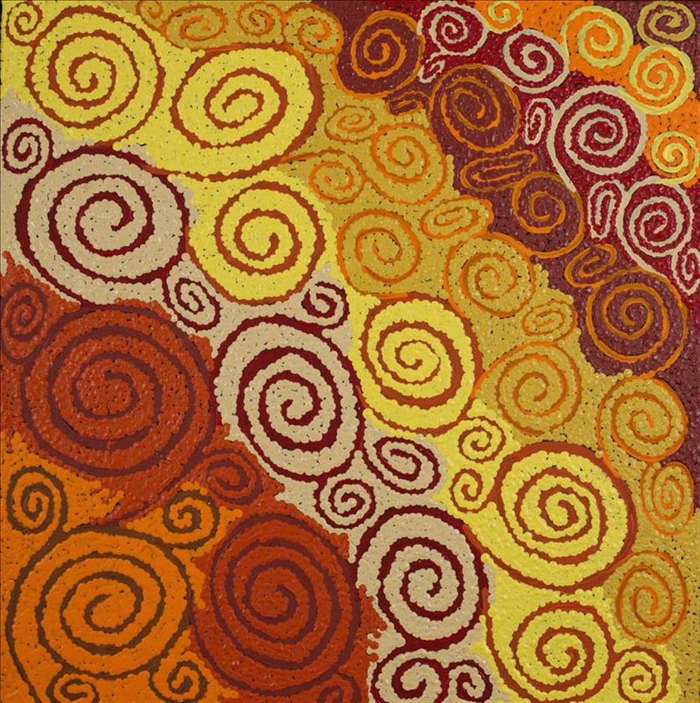 Mina Mina is the area or country this painting is depicting. It is far west of Yuendumu and is very important to the Napangardi/Napanangka women. These women and their Japangardi/Japanangka brothers, are the custodians of the Jukurrpa that created the area. This story (Dreaming) tells of the journey of a group of women who travelled east gathering food, ngalyipi‟ (snake vine) and performing ceremonies as they journeyed. The ‘ngalyipi’ vine grows up the trunks and branches of the ‘kurrkara’ (desert oak trees. ‘Ngalyipi’ is a sacred vine to Napangardi and Napanangka women that has many uses. It can be used as a ceremonial wrap, as a strap to carry ‘parrajas’ (wooden bowls) that are laden with bush tucker and as a bandage for headaches.