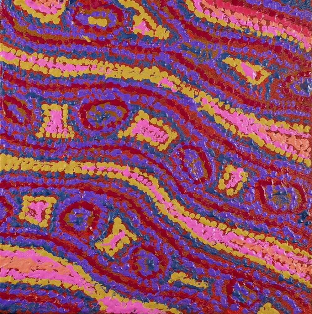 As a child living in Nyirripi, Magda would often watch her grandmothers and grandfathers paint and listen to them as they told her stories of their country. Her Grandparents have passed away since but her Big Sister Mary Anne Nampijinpa Michaels is like a Grandmother to her. She likes painting her Big Sister’s dreaming, Lappi Lappi Jukurrpa, a rock hole in country belonging to her grandmother. Besides painting Lappi Lappi Jukurrpa, Magda paints her Ngapa Jukurrpa (Water Dreaming) Jajiidi Jukurrpa (Western Quoll Dreaming) and Wardapi Jukurrpa (Goanna Dreaming), Dreamings which relate directly to her land, its features and animals.