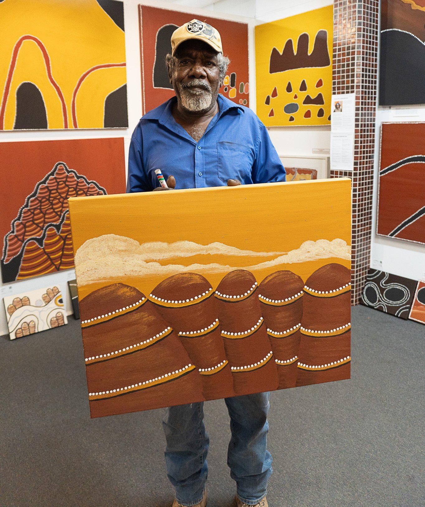 Born in Derby in 1968, Mark Nodea lives in Turkey Creek (Warmun) and is a respected figure in his community. A former Chairperson of Warmun Art Centre, Mark is a passionate ambassador for both his people and the traditional ochre art of the East Kimberley.