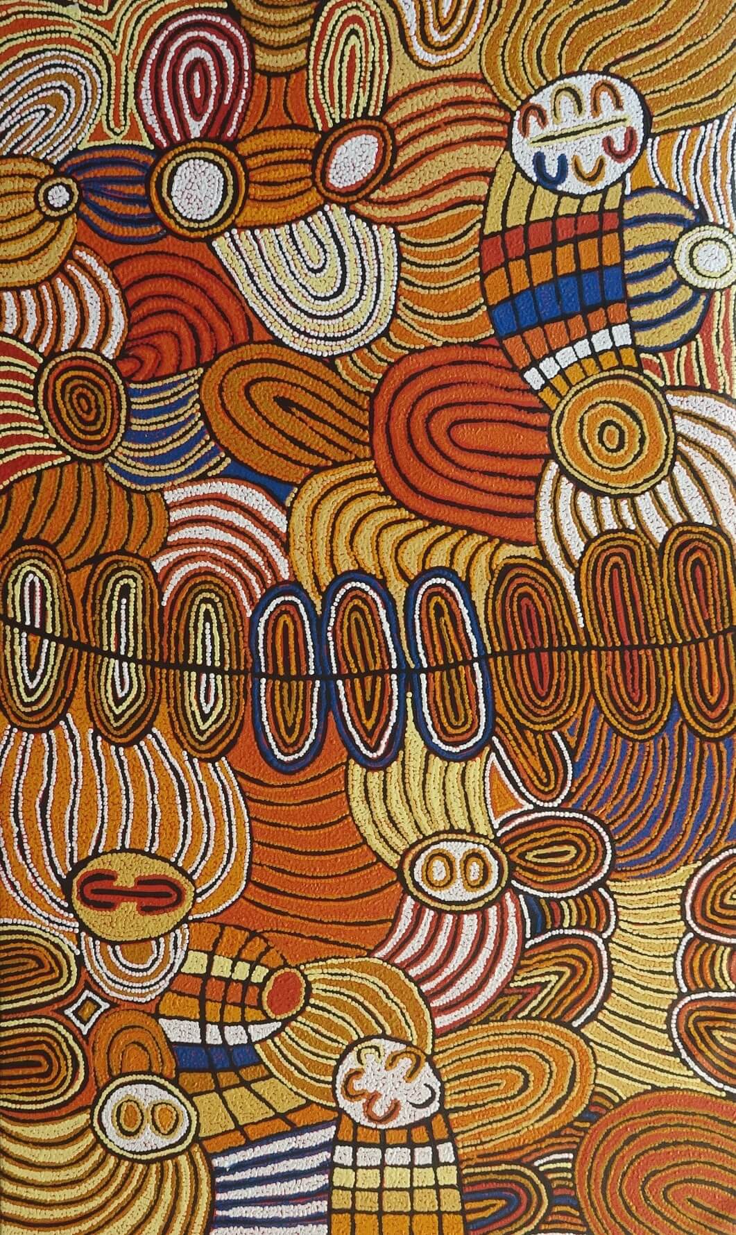 Marlene paints ‘Women’s Ceremony’ depictions of her country and the sacred women’s sites between the communities of Kintore and Kiwirkurra in the Western Desert of Central Australia. Her people would conduct important ceremonies at these sites and tell stories of travelling ancestors who would gather at these sites to rest, sing and dance. Marlene’s choice of colours represent the more traditional pigments used for ground designs and body decoration sometimes interspersed with colour. Her sense of design and movement shows the close association between painted images and the physical landscape.
