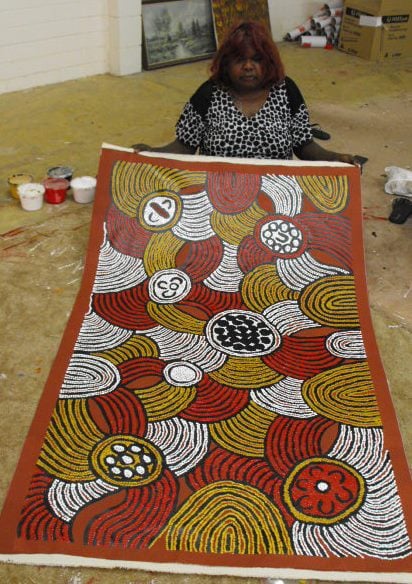 Marlene’s main Dreaming stories include important women’s dreamings and the body paint designs associated with them. Marlene’s use of thick layered paint is one of her trademarks.