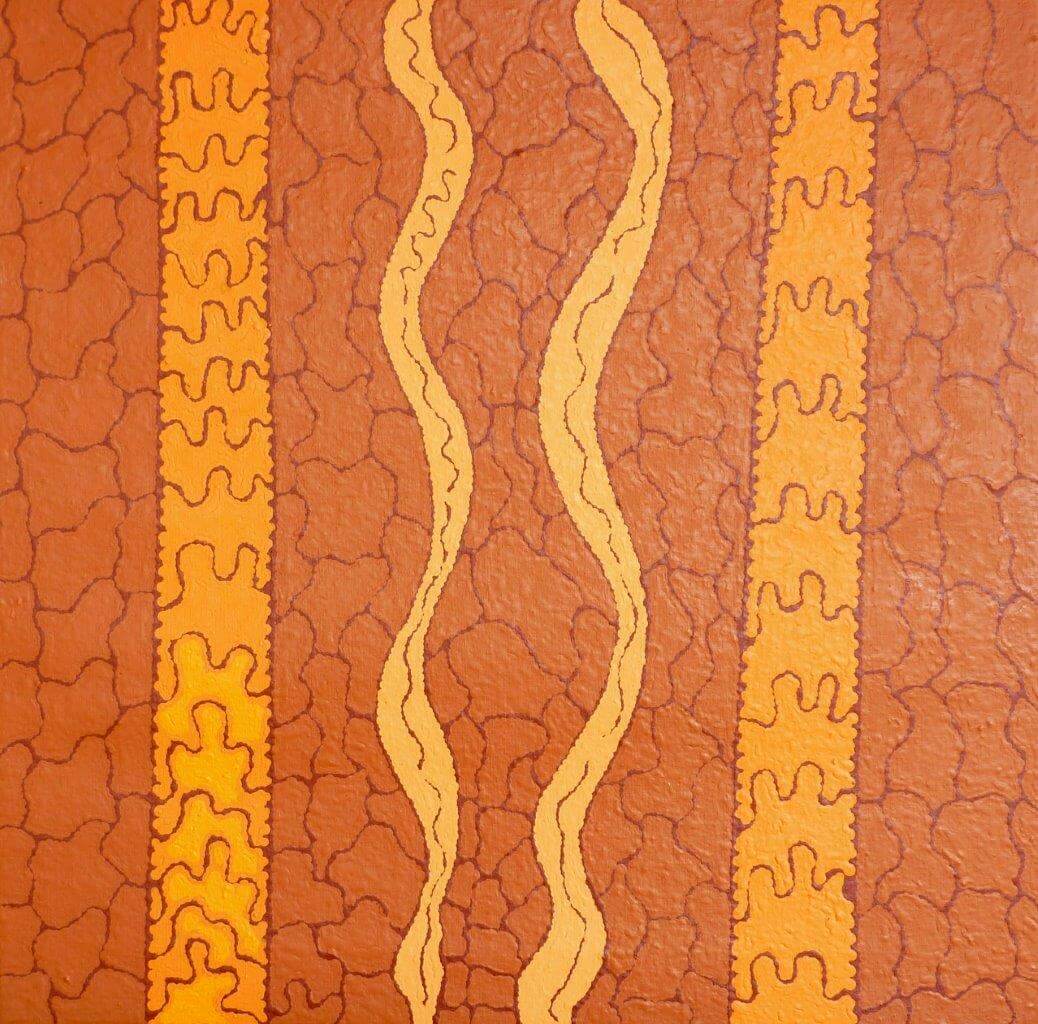 Pikilyi is a large and important waterhole and natural spring near Mount Doreen station. Pikilyi Jukurrpa (Vaughan Springs Dreaming) tells of the home of two rainbow serpents, ancestral heroes who lived together as man and wife. The woman ‘rainbow serpent’ was of the Napanangka skin group, the man was a Japangardi. This was a taboo relationship contrary to Warlpiri religious law. Women of the Napanangka and Napangardi subsection sat by the two serpents, picking lice off them. For this service, the two serpents allowed the women to take water from the springs at Pikilyi. This was because the serpents were the ‘kirda’, or ceremonial owners, for that country. The spirits of these two rainbow serpents are still at Pikilyi today. This Dreamings belongs to the women and men of the Japanangka/Napanangka and Japangardi/Napangardi skin groups.