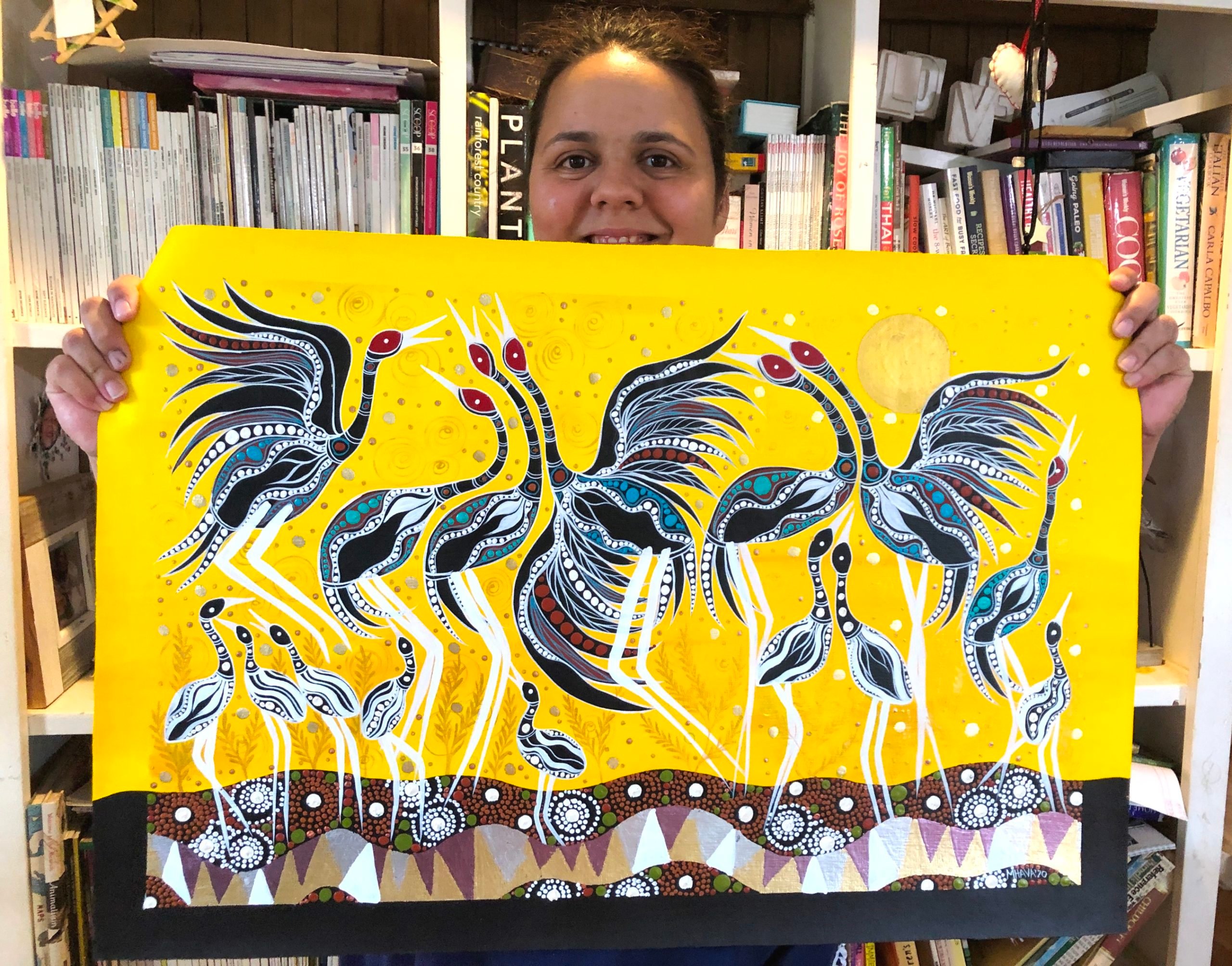 I found myself out of the rat race of paid work and a lot of extra time on my hands (post daughter and pre son that is!). So I indulged myself with painting every moment that I could. I’ve since joined up with more galleries, had several exhibitions both solo and group, painting in Mount Isa, Toowoomba and Yowah before settling down in beautiful and inspiring Far North Queensland’s Cairns city – close at hand to my mother’s country and generations past and present.