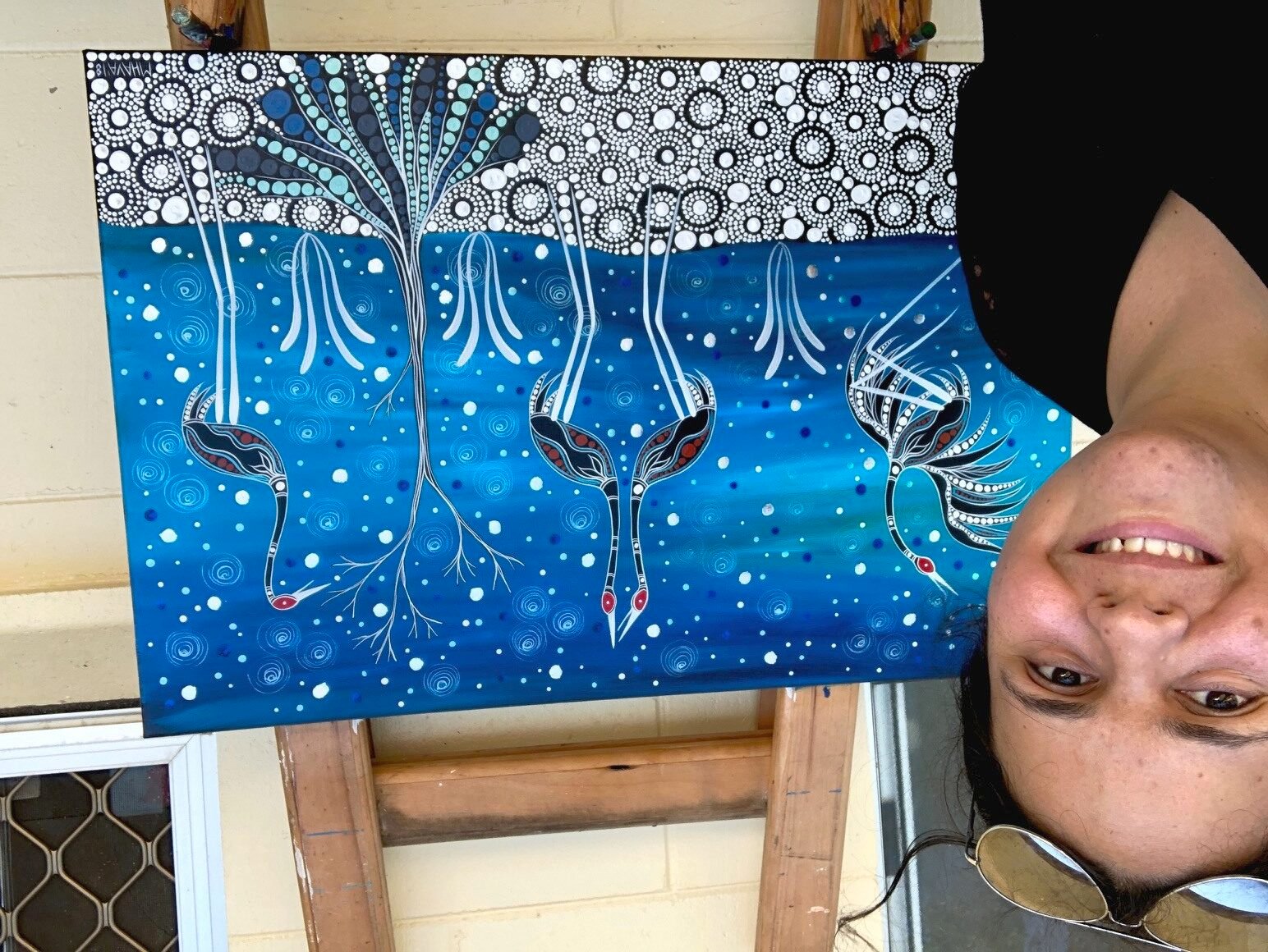 I found myself out of the rat race of paid work and a lot of extra time on my hands (post daughter and pre son that is!). So I indulged myself with painting every moment that I could. I’ve since joined up with more galleries, had several exhibitions both solo and group, painting in Mount Isa, Toowoomba and Yowah before settling down in beautiful and inspiring Far North Queensland’s Cairns city – close at hand to my mother’s country and generations past and present.