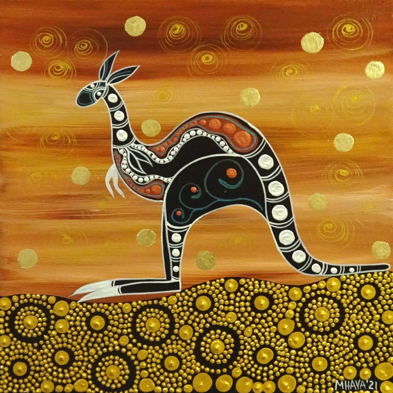 This art sold very quickly in the little opal mining outback town of Yowah way out back of western Queensland. This red soil country still influences my works. When I was in my late teens/early twenties, I started playing around with the ideas of combining my Aboriginal and Austrian inspirations. I had already tried my style in Aboriginal, Folk and Abstract arts and I had had a successful first exhibition at Outback at Isa Gallery (and right now coming up to a 10 year anniversary exhibition with them).