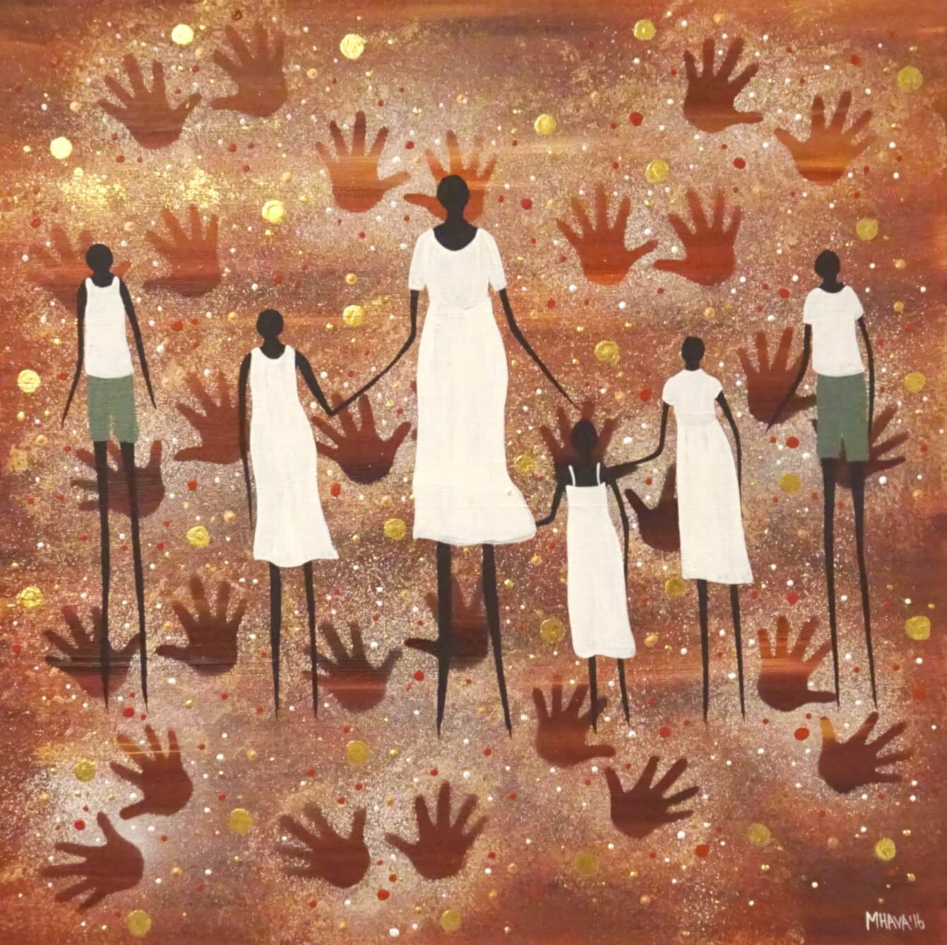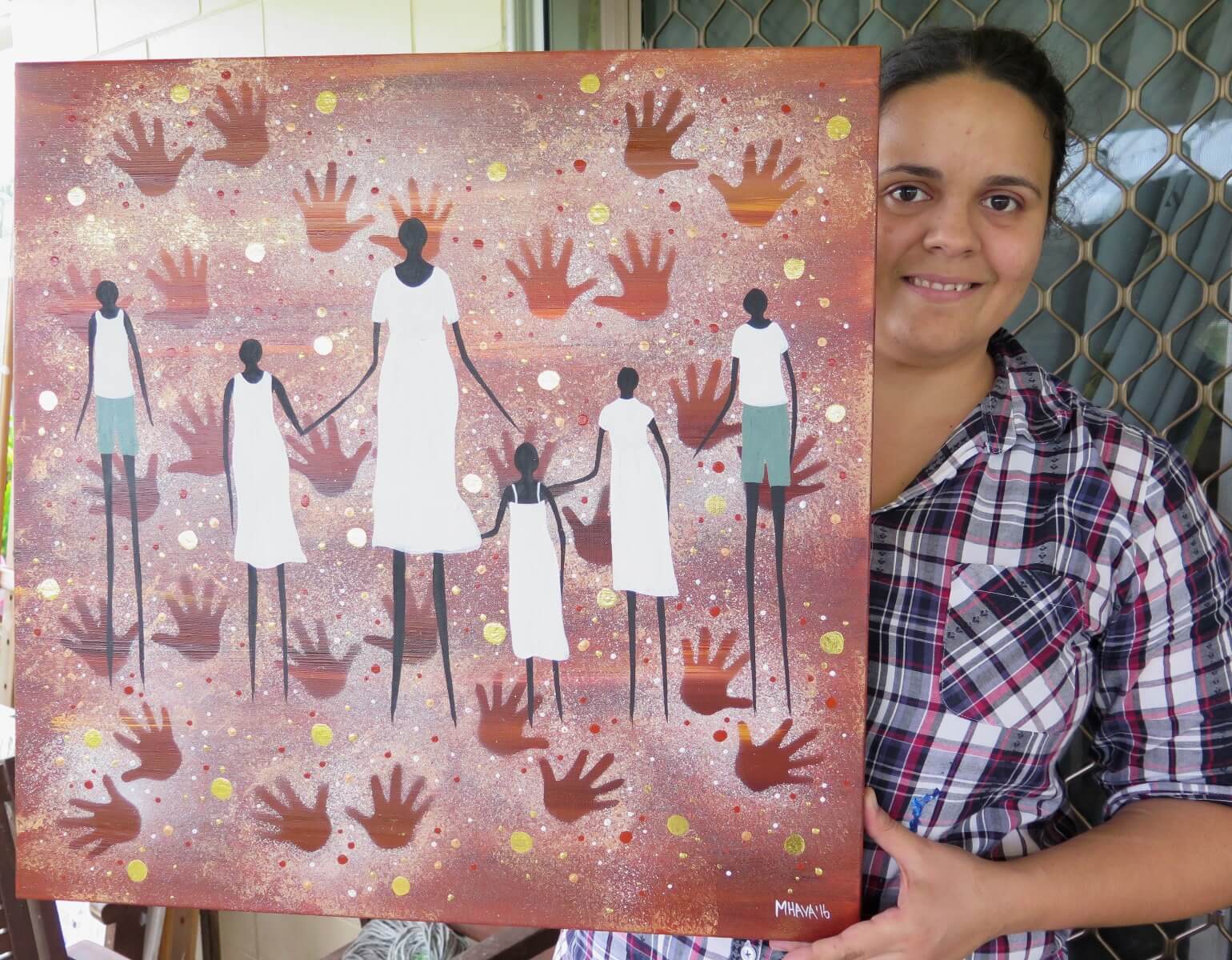 This painting is of Grandma’s mum, Grannie Minnie/Goombun and her children – Moonyinoh/Barney (d1969) and Mahnjoh/Tom (d1982) and the three girls – Jimurroh/Mabel (d1981), Yahjunoh/Doreen and Lorna/Lola. The oldest photo we have on record is from Brooks Road c.1920, showing my Grandma’s Grandad – our native title Apical Ancestor Duginyoh (English name Paddy), two young women “balgari” (grown woman) one with a baby, three children perhaps all boys under about 10 years, and Duginyoh’s daughter Goombun/Minnie with a “jaja” (baby) Mahnjoh/Tom and probably also Moonyinoh/Barney. Goombun/Minnie looks not older than 30. The next photo we have of Grannie Minnie is from my Grandma and Grandad’s place at Silkwood, and Goombun/Minnie is aged over 60, respectuflly a “jambi” or older woman. We have maybe two more photos of Minnie. The handprints stand for the Ancestors watching over these “murraymba” Aboriginal people, and watching over the continuing generations now “janyja” and into the future and Dreamtime “bulurru”. From just Minnie’s part of the family line I have 18 Aunts and Uncles (and my Mum), 40 immediate first cousins, and my children have at this stage 30 cousins. Our line is just one of three Brooks’ family lines plus one more, so my cousins number over 200! It’s so important the stories about family and about country and culture are being properly passed on (and pulled together!)