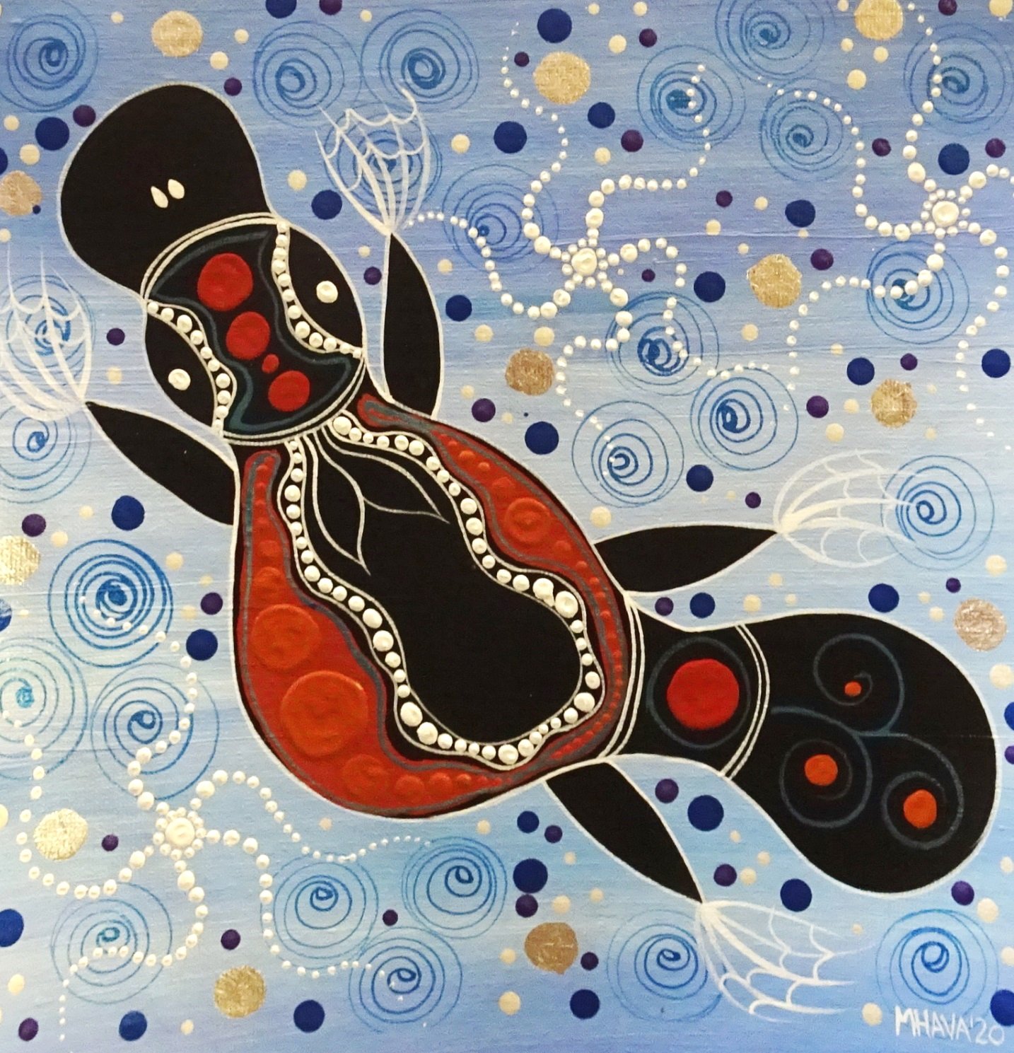This art sold very quickly in the little opal mining outback town of Yowah way out back of western Queensland. This red soil country still influences my works. When I was in my late teens/early twenties, I started playing around with the ideas of combining my Aboriginal and Austrian inspirations. I had already tried my style in Aboriginal, Folk and Abstract arts and I had had a successful first exhibition at Outback at Isa Gallery (and right now coming up to a 10 year anniversary exhibition with them).